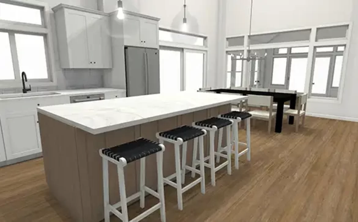 At the core of the design: timeless finishes with a nod to classic comfort. Custom cabinetry in a soft white hue offers ample storage without overpowering the room. Quartz countertops add durability with refined appeal, while sleek hardware and elevated plumbing fixtures bring a layer of polish. A generous island anchors the space, offering room for food prep, casual dining, and effortless entertaining.