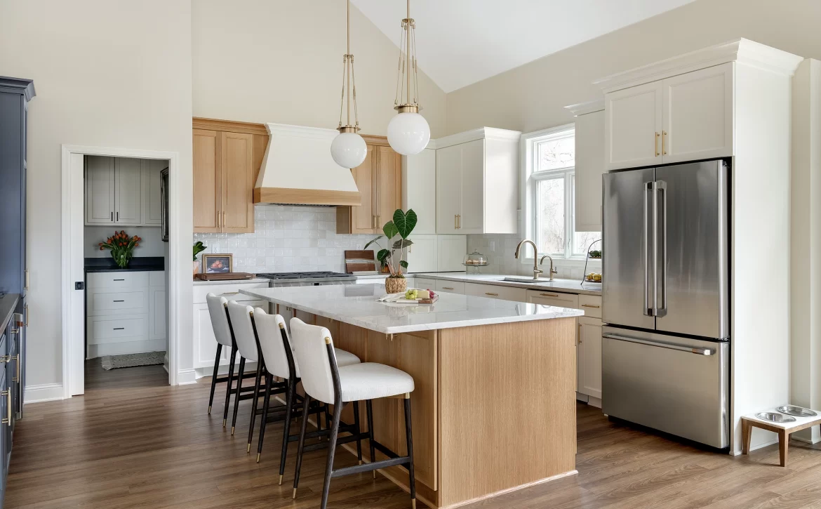 Thoughtful lighting and material selections—subtle tilework, curated fixtures, and cohesive finishes—carry the home’s transitional style throughout, tying into the adjacent rooms while allowing the kitchen to shine on its own. The result is a hardworking yet beautiful space that supports everything from slow Sunday mornings to lively dinner parties with friends.