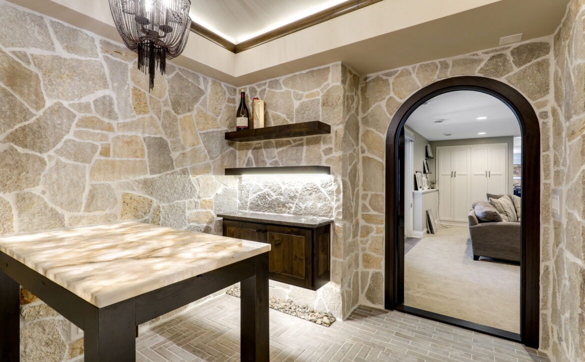 A custom LED-backlit granite table serves as the room’s centerpiece, blending style with practicality for tastings and gatherings.