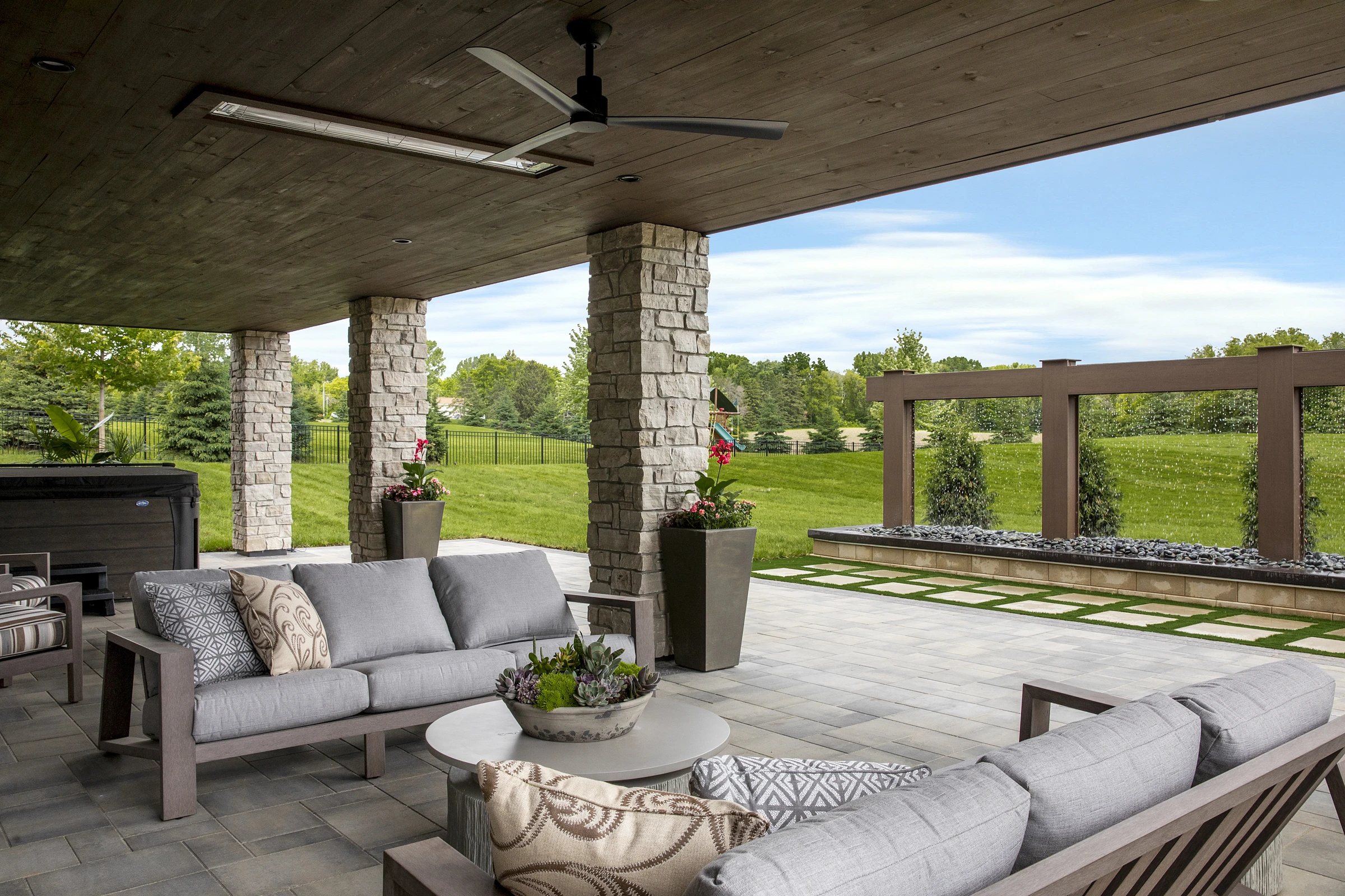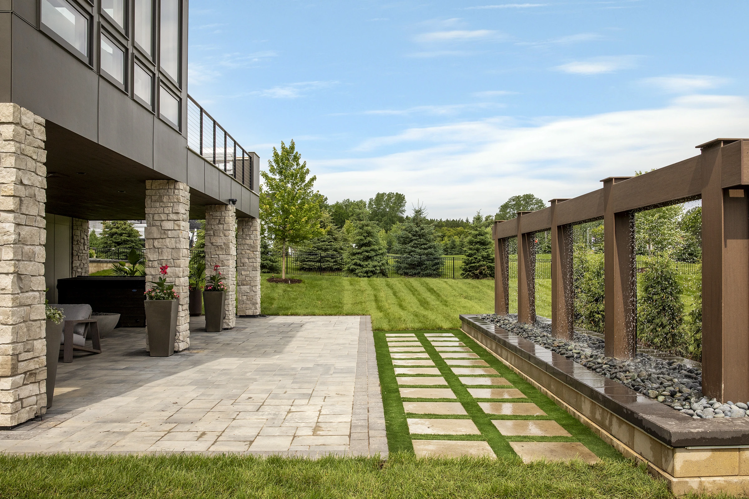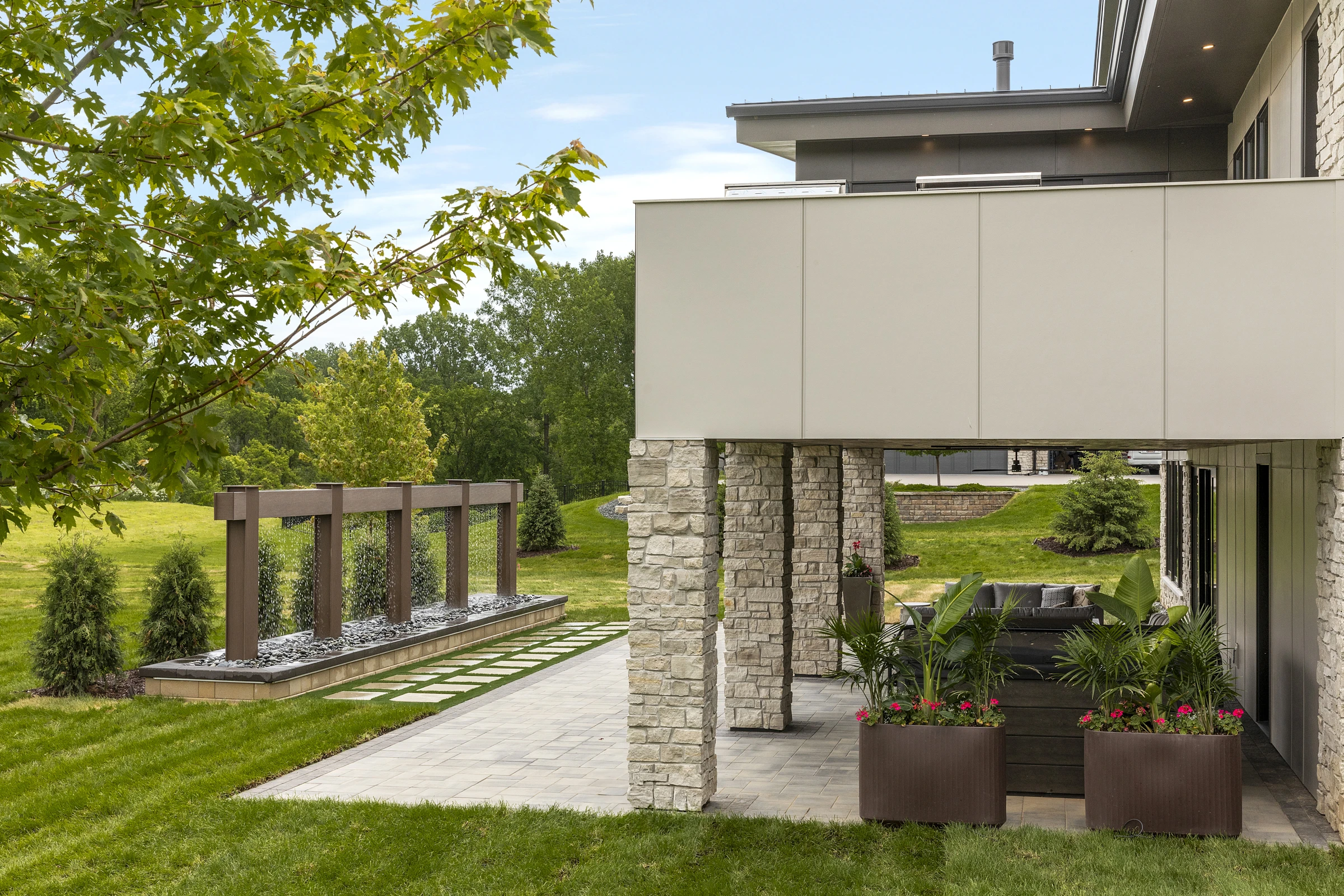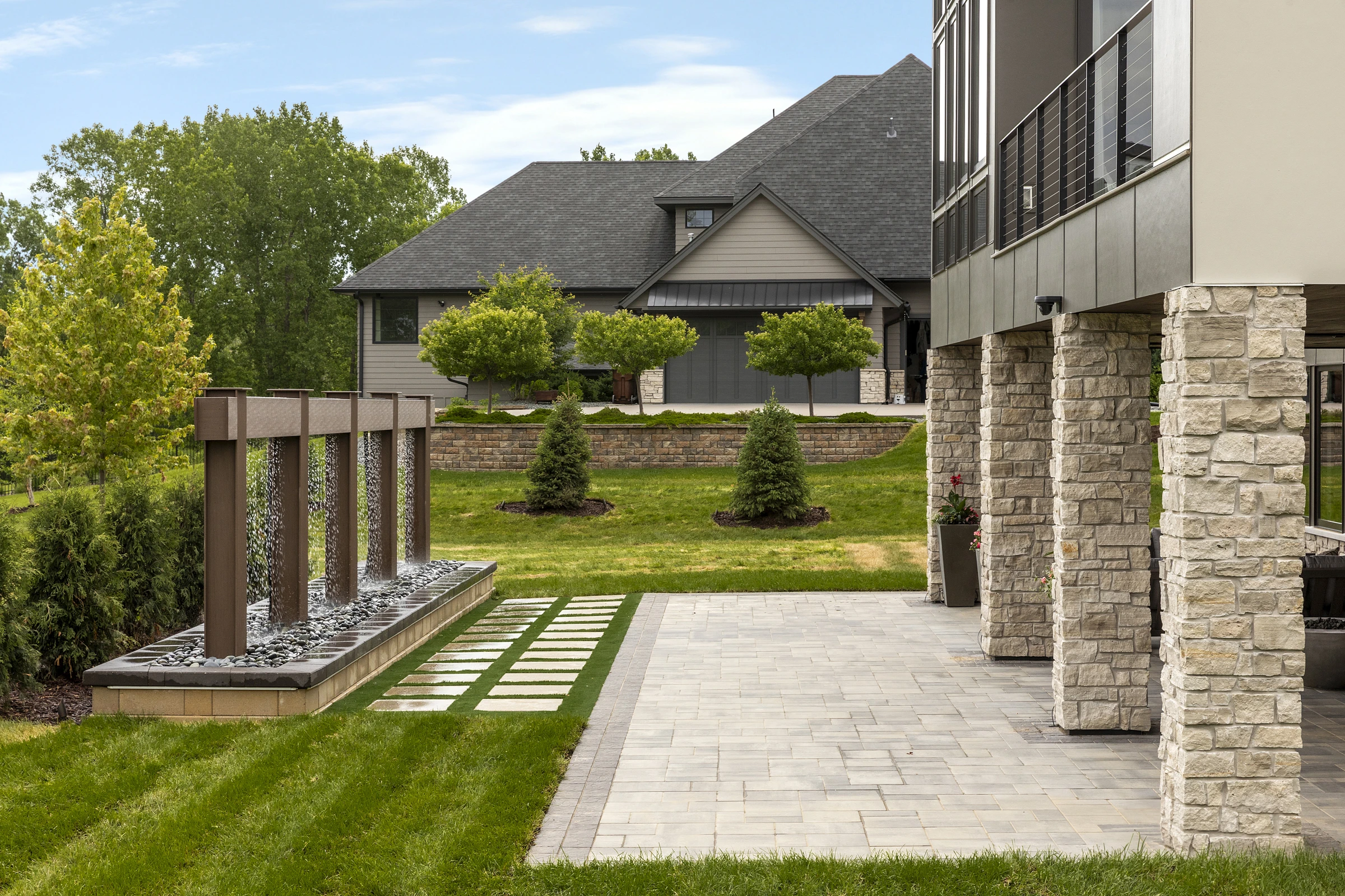 The elegant stone exterior, complemented by bronze Andersen windows, sets the stage for refined style. The specialty landscape design features an expansive driveway with a turning circle that revolves around a unique water feature, serving as one of the many wow-factors of this exterior. In the backyard, Custom One Landscaping installed a custom water wall for the homeowners to enjoy. Landscape lighting ensures this work of art can be enjoyed day and night. The meticulously landscaped yard provides ample space for activities. The patio area is perfect for al fresco dining or simply enjoying the serene surroundings.