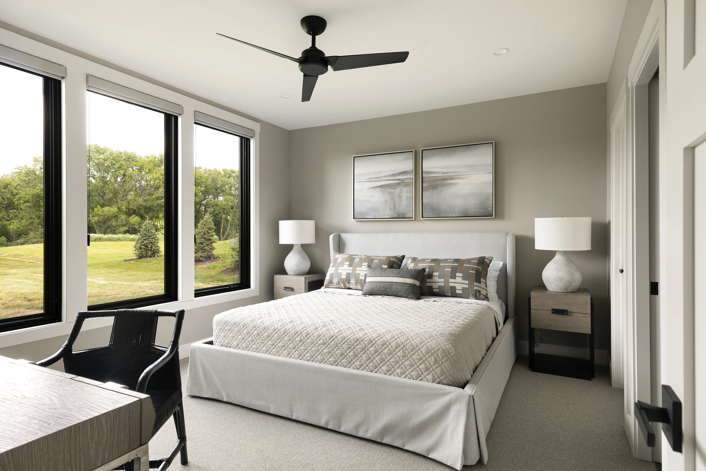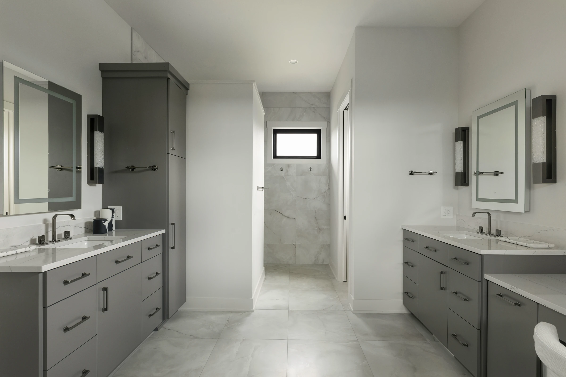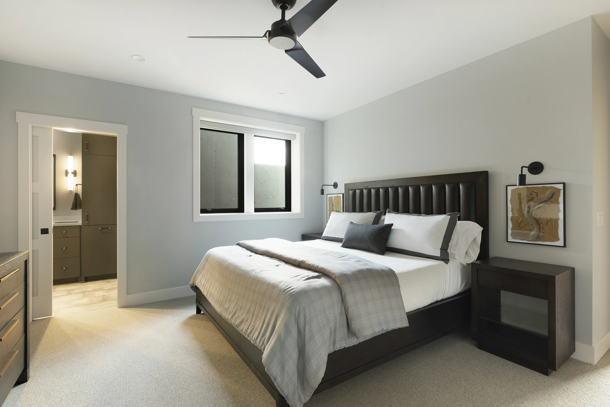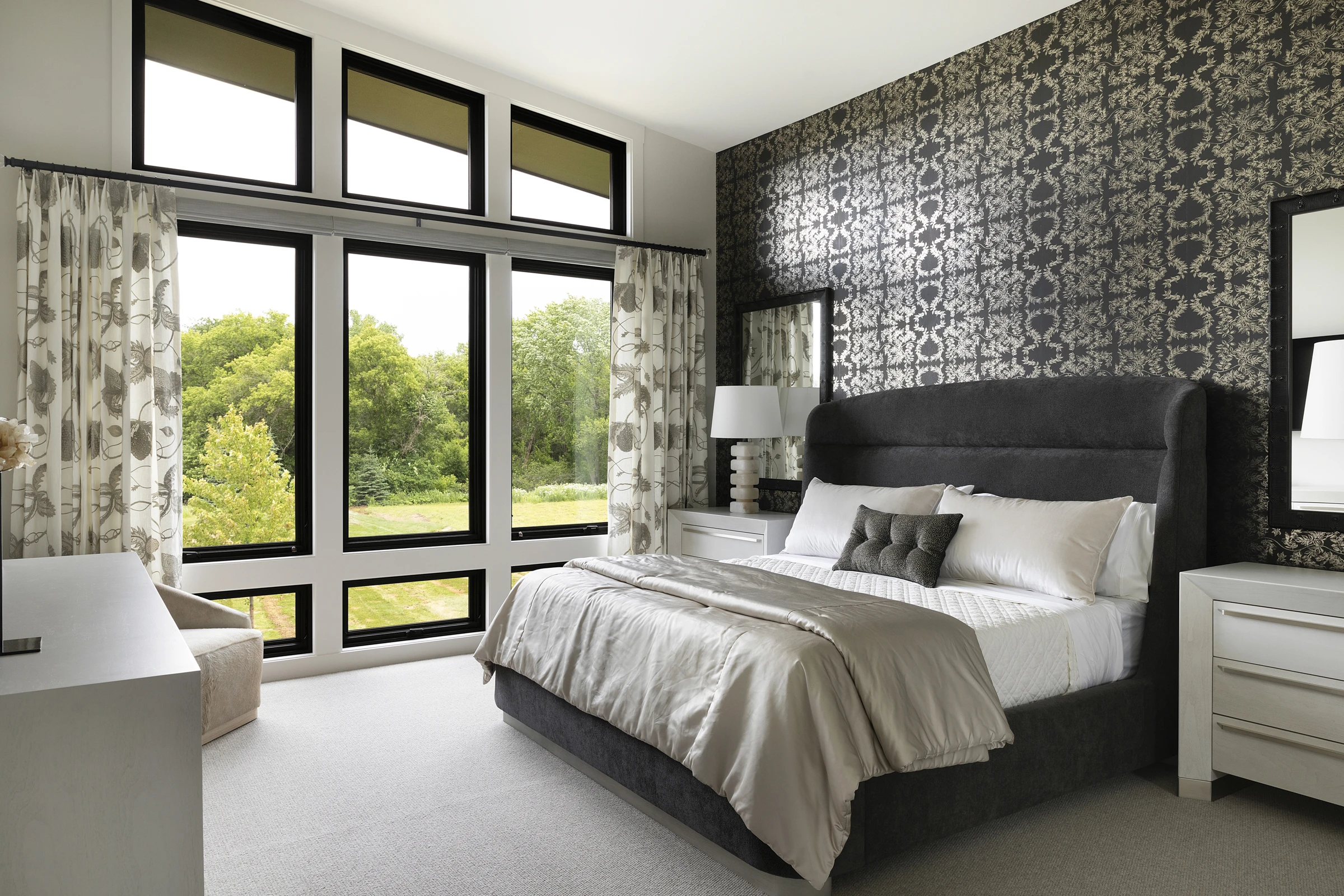 Modern Elegance has four generously sized bedrooms. Each bedroom includes an ensuite bathroom for privacy and convenience. The primary suite is a true retreat with a spa-like bathroom and his-and-her closets. Expansive windows throughout the home flood the space with natural light. They offer stunning views of the landscape, enhancing the indoor-outdoor living experience.