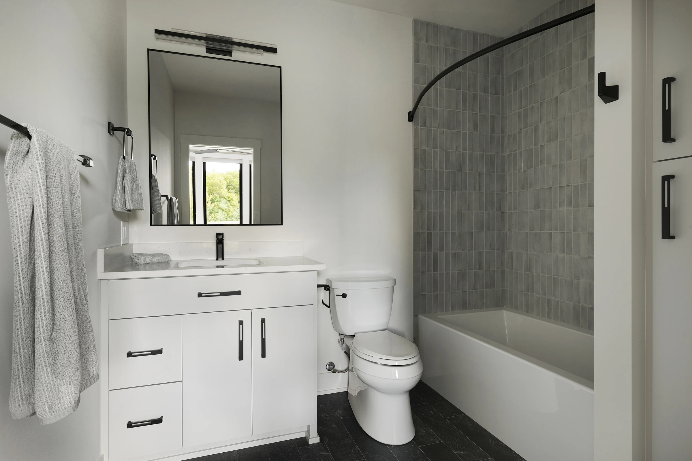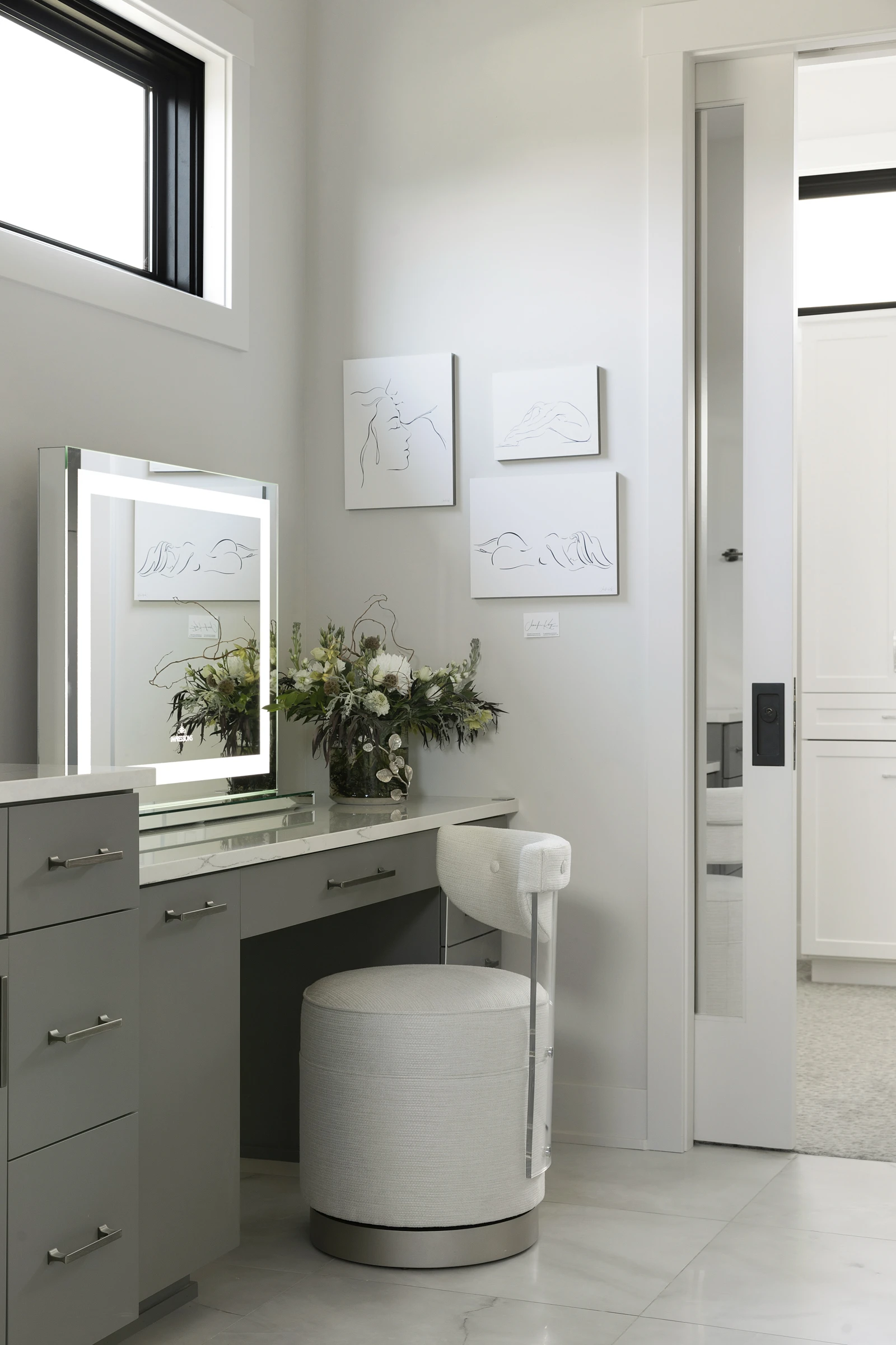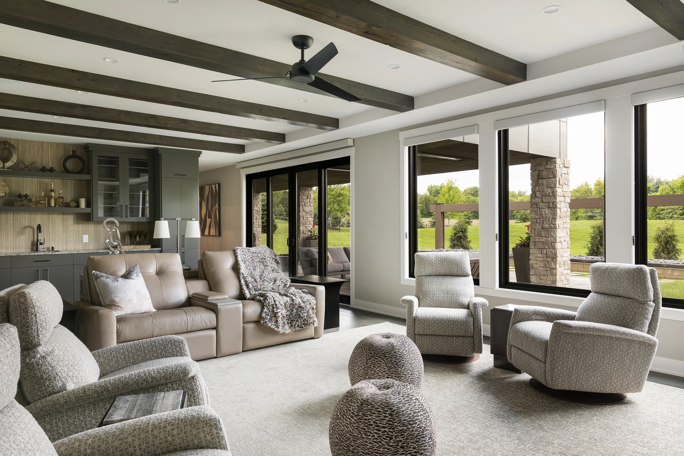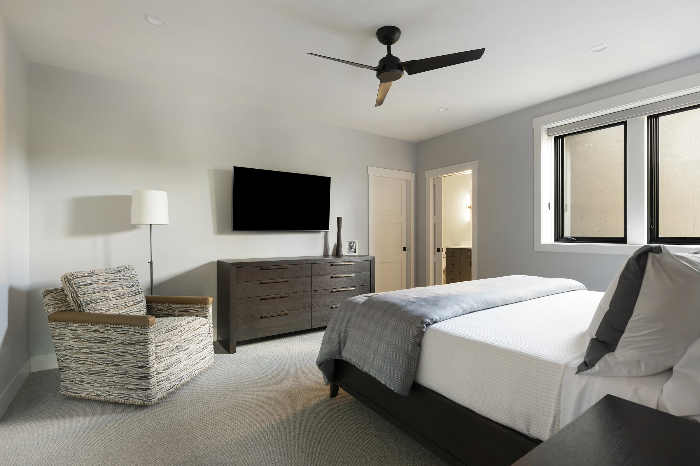 Modern Elegance has four generously sized bedrooms. Each bedroom includes an ensuite bathroom for privacy and convenience. The primary suite is a true retreat with a spa-like bathroom and his-and-her closets. Expansive windows throughout the home flood the space with natural light. They offer stunning views of the landscape, enhancing the indoor-outdoor living experience.