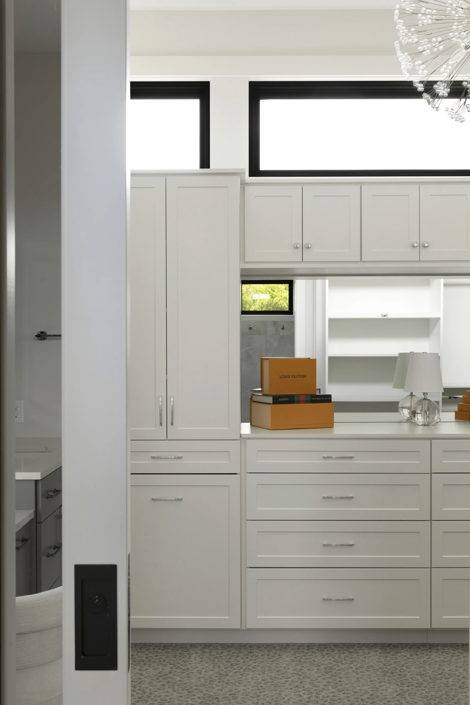 The homeowners wanted a modern and sophisticated residence. They desired clean lines, ample space, and a seamless indoor-outdoor flow. This vision came to life with an open floor plan connecting the living, dining, and kitchen areas. It’s perfect for entertaining guests or enjoying family time. The spacious foyer greets you with a sense of luxury. The kitchen, a chef’s dream, features sleek cabinetry, GE Monogram, and Fisher & Paykel stainless steel appliances. The double kitchen islands, topped with Cambria countertops, are ideal for casual dining and meal preparation, offering both beauty and functionality.