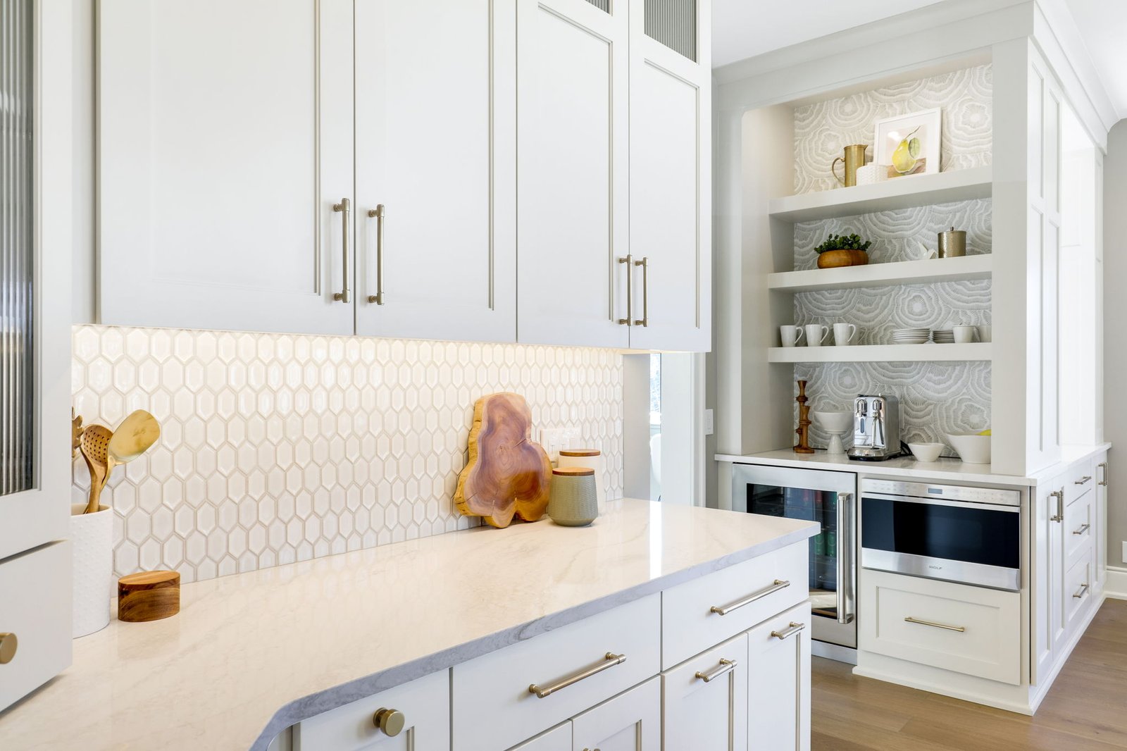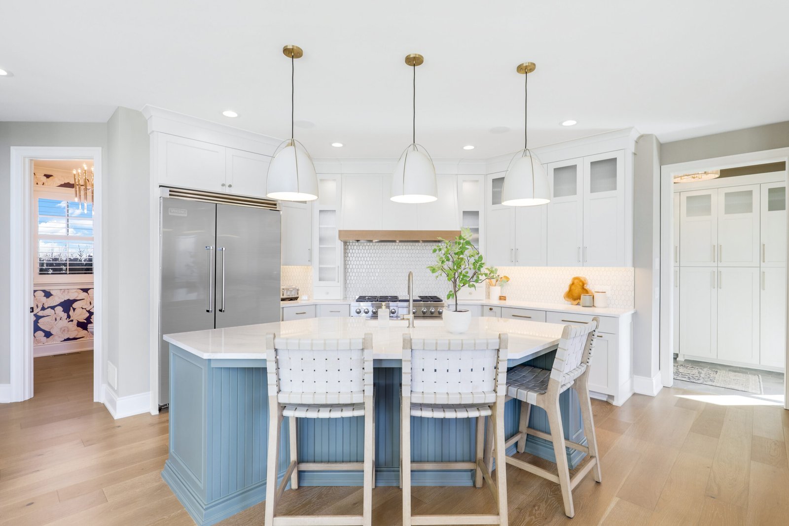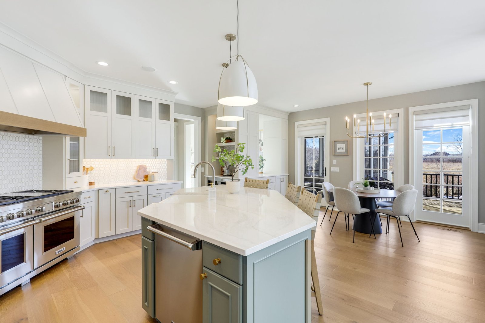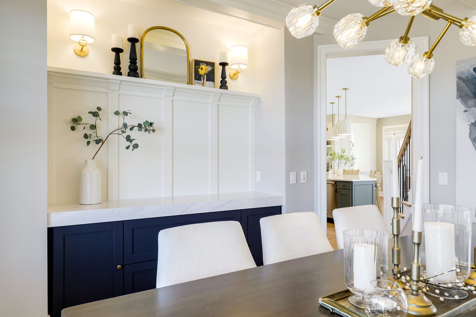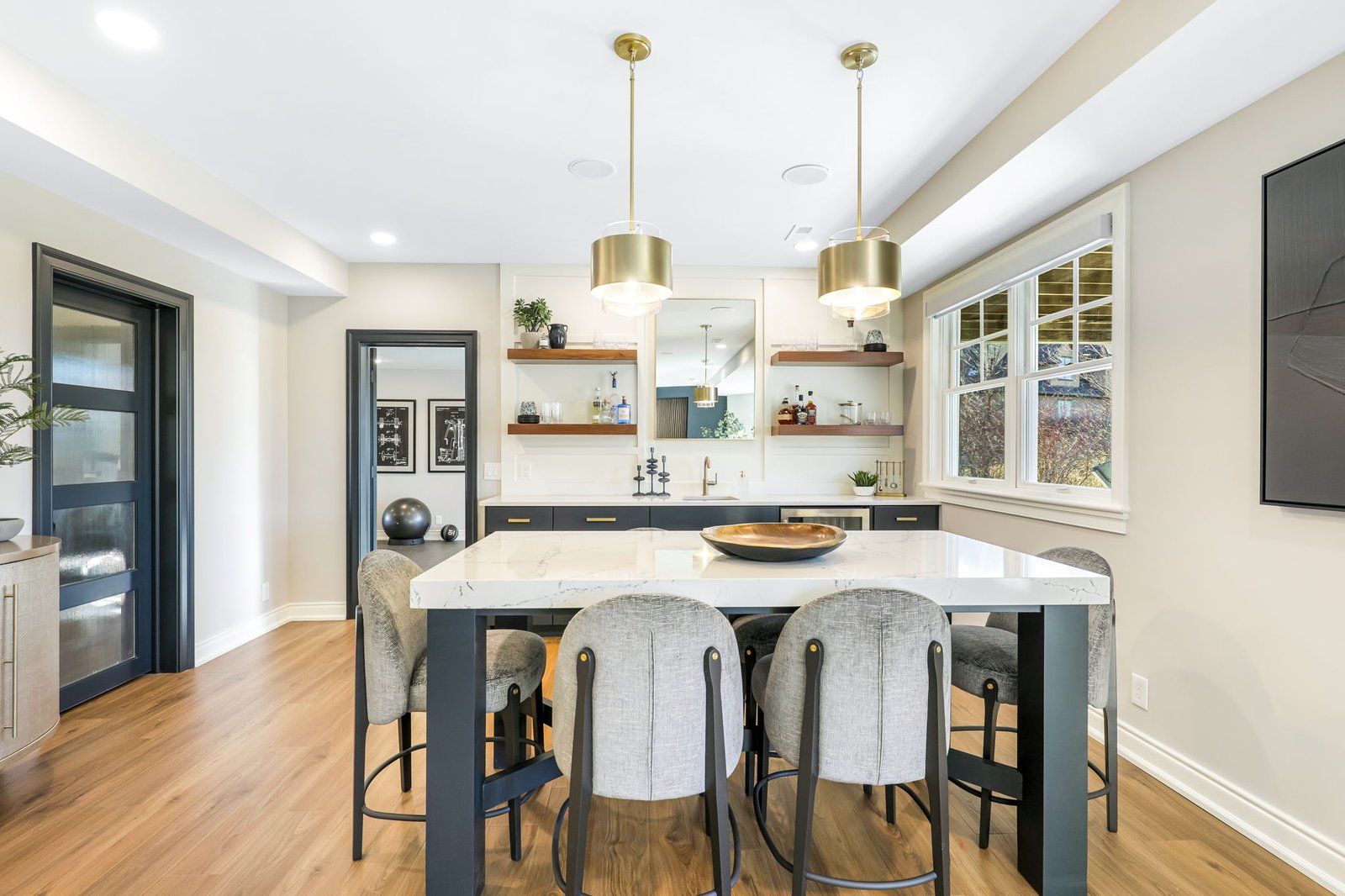 In the kitchen, a built-in hutch was removed to make room for a sleek coffee bar. This feature adds both style and function, perfect for everyday use. Light finishes and a wider opening to the dinette made the entire area feel more connected and spacious. Modern appliances, a large island, and elegant pendant lights complete the transformation, making it an ideal gathering space for family and friends.