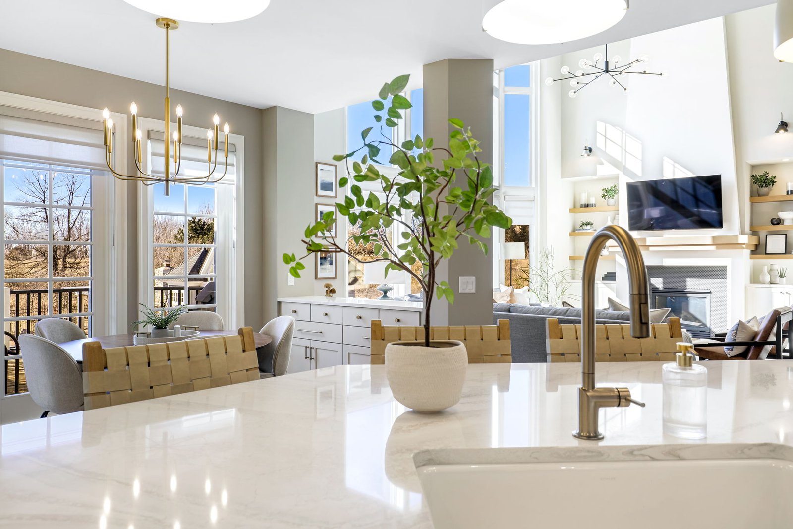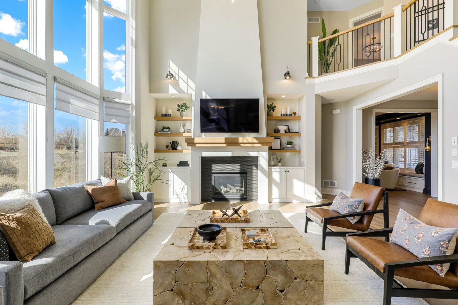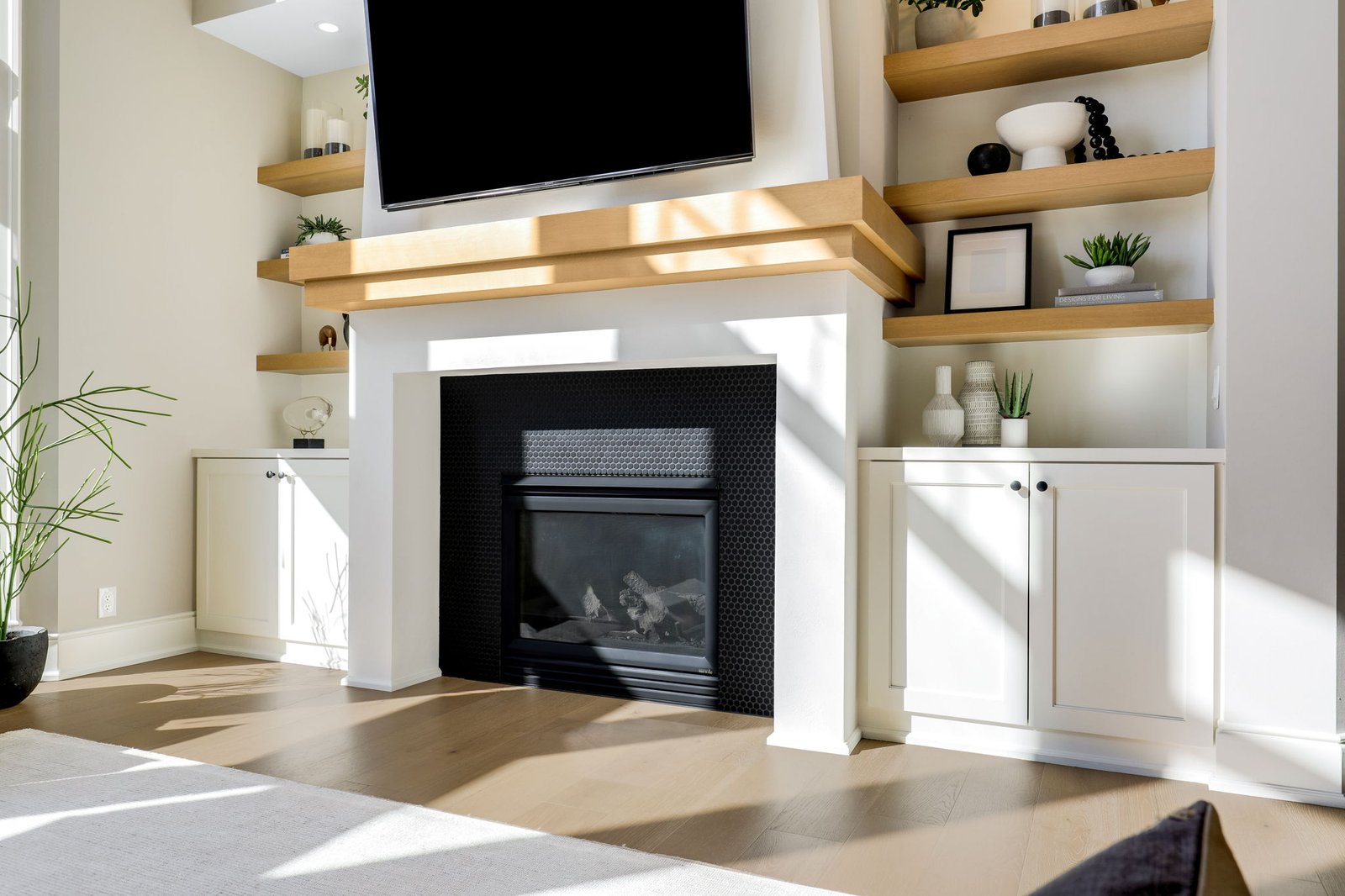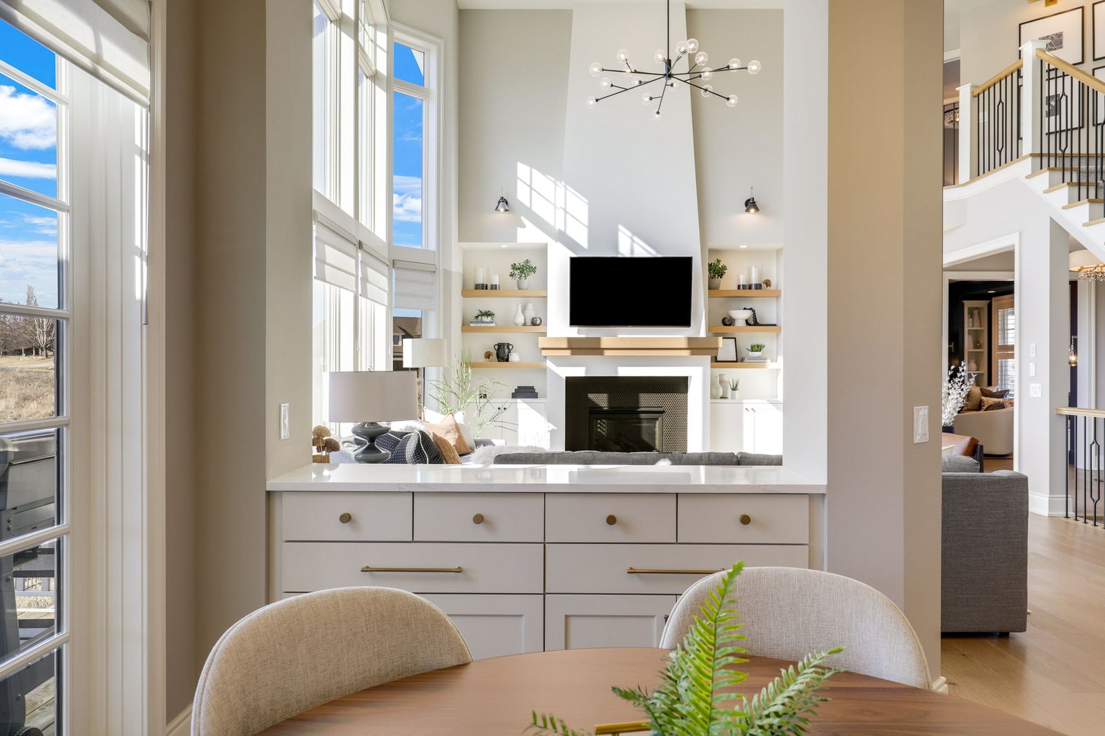 The great room became the heart of the renovation. To create a dramatic focal point, we extended the fireplace chase and applied a textured Venetian limestone plaster finish. Custom cabinetry and shelving on both sides added balance and sophistication. Large windows and modern lighting now flood the space with natural light, giving it a bright, open feel.