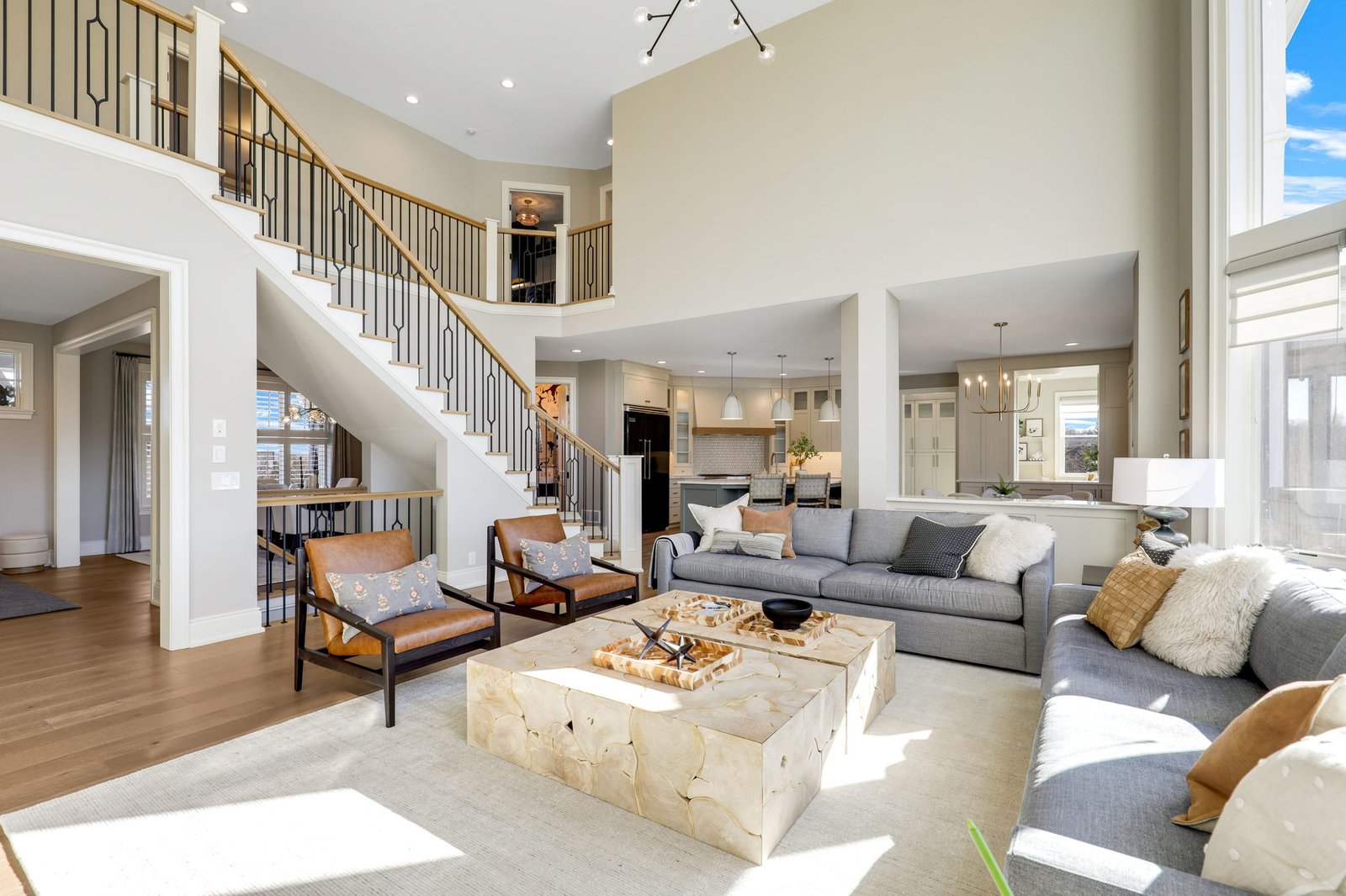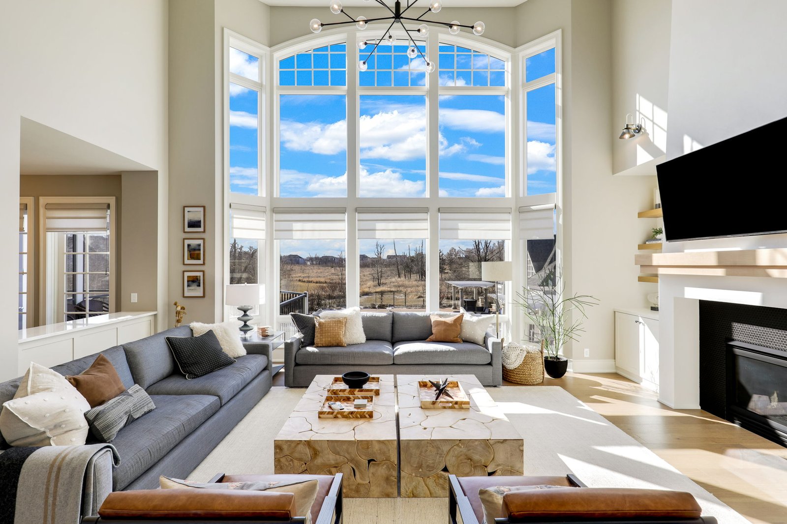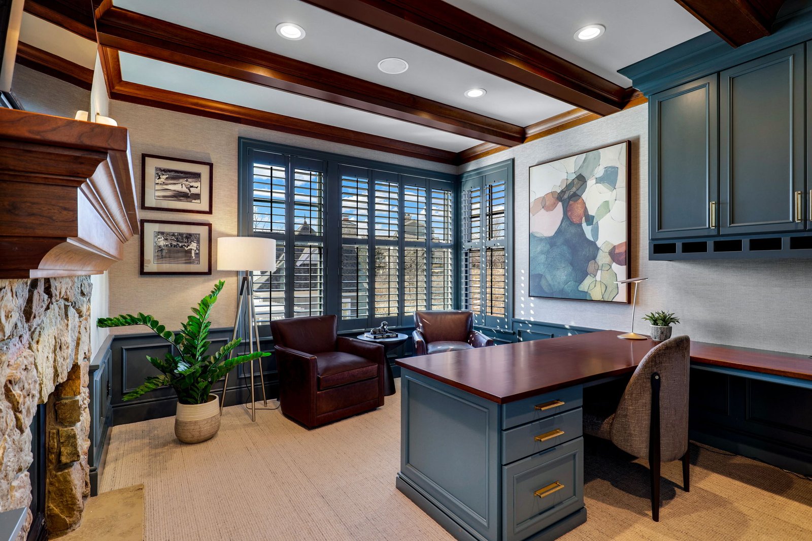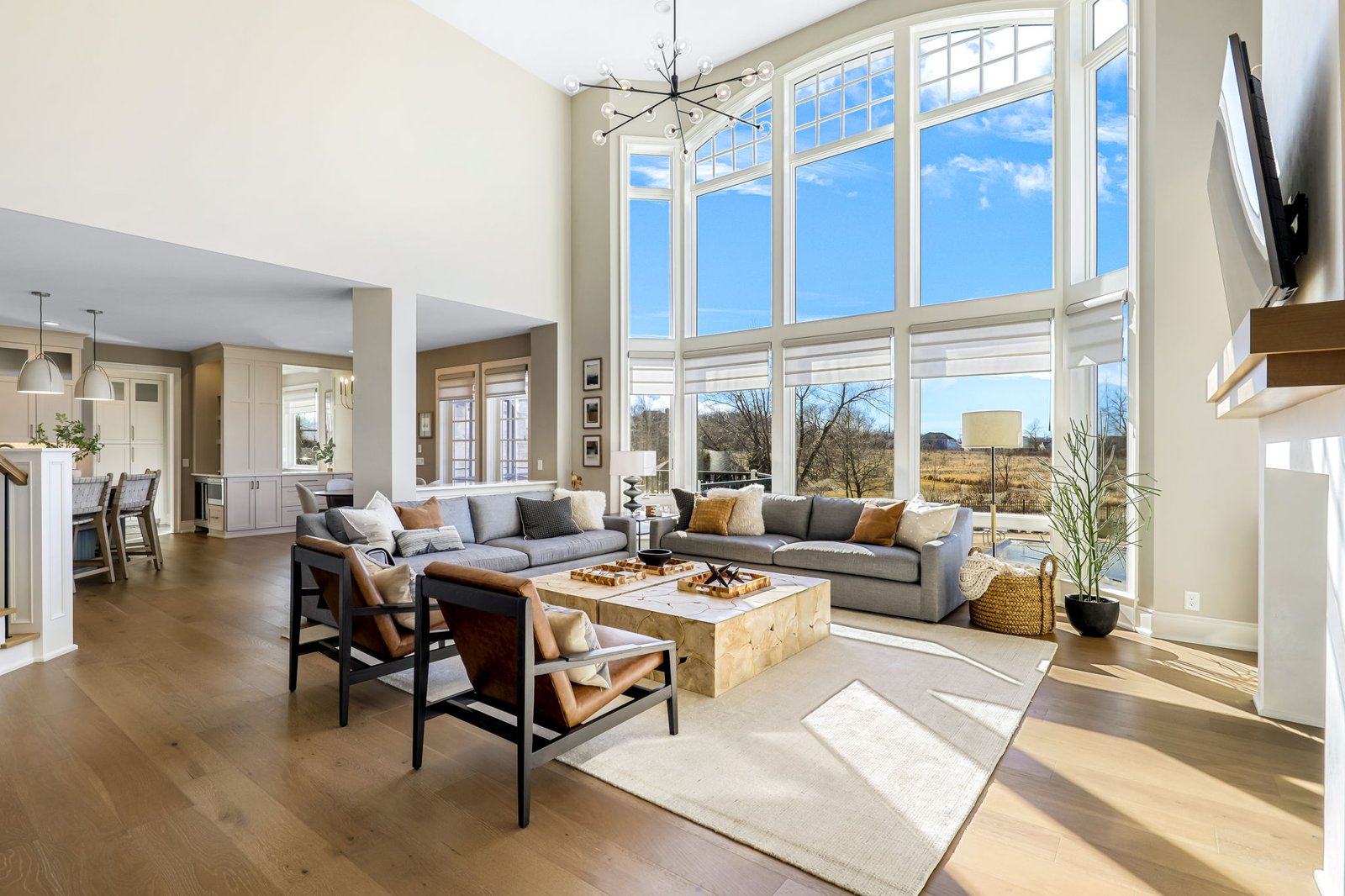 The great room became the heart of the renovation. To create a dramatic focal point, we extended the fireplace chase and applied a textured Venetian limestone plaster finish. Custom cabinetry and shelving on both sides added balance and sophistication. Large windows and modern lighting now flood the space with natural light, giving it a bright, open feel.