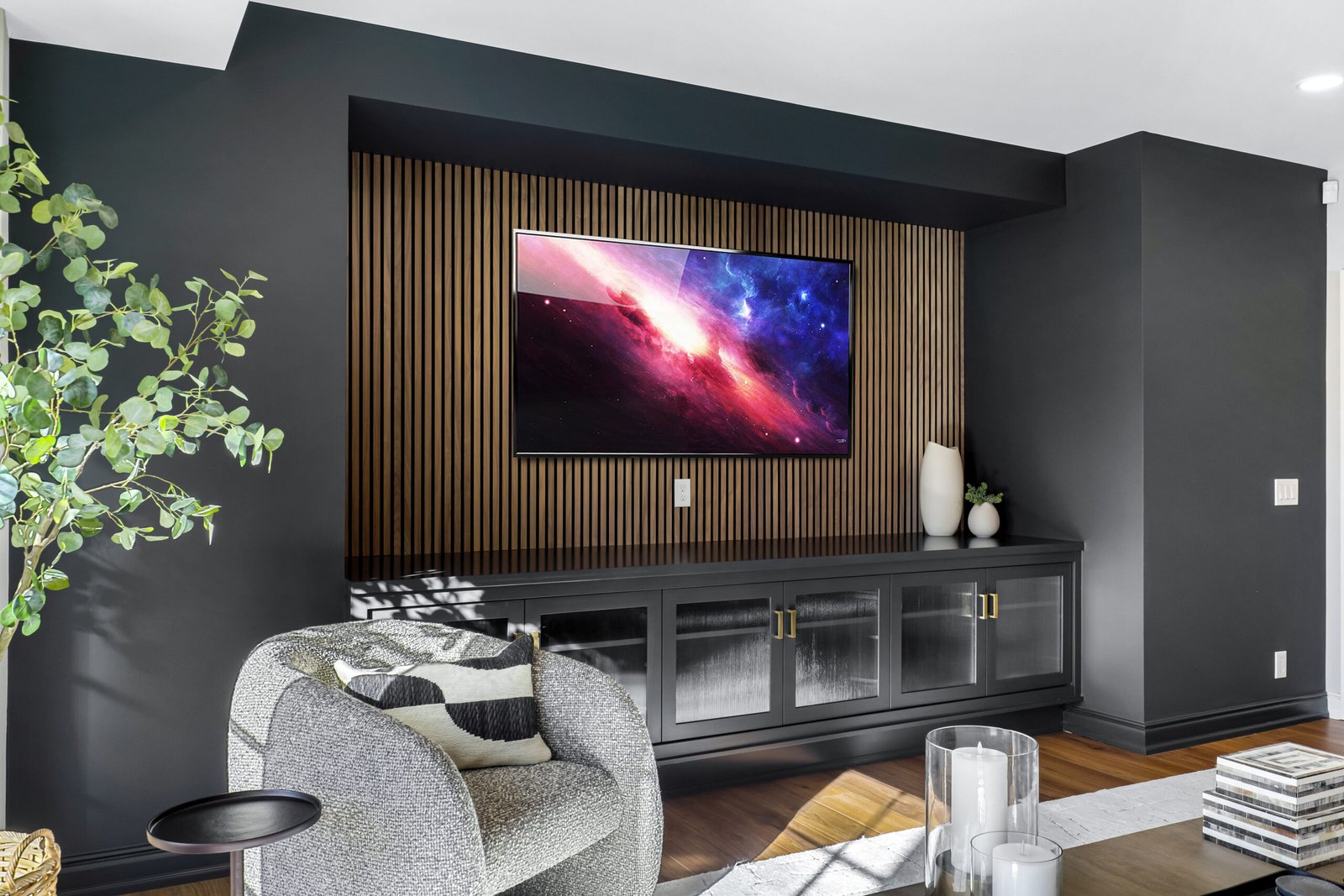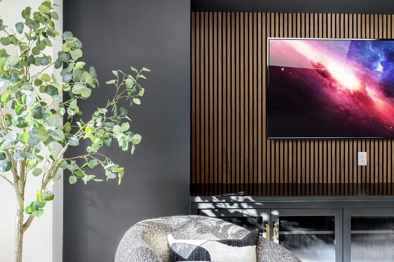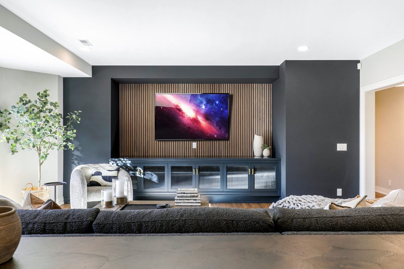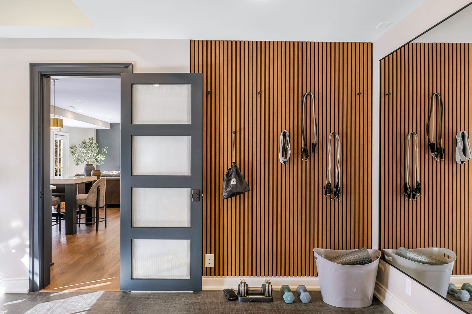The lower level was transformed into a vibrant space for entertainment and relaxation. A sleek bar with black cabinetry and modern lighting offers the perfect setting for hosting. In the exercise room, a wood slat accent wall adds warmth and character. This level also includes a cozy living room, a guest bedroom, and an updated bathroom, creating a versatile area for family use.