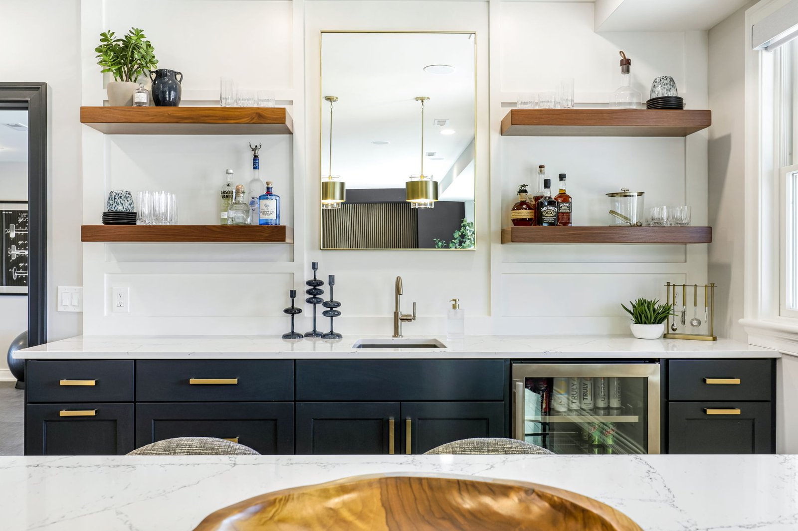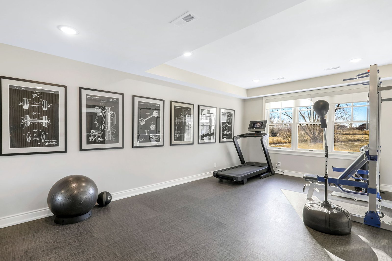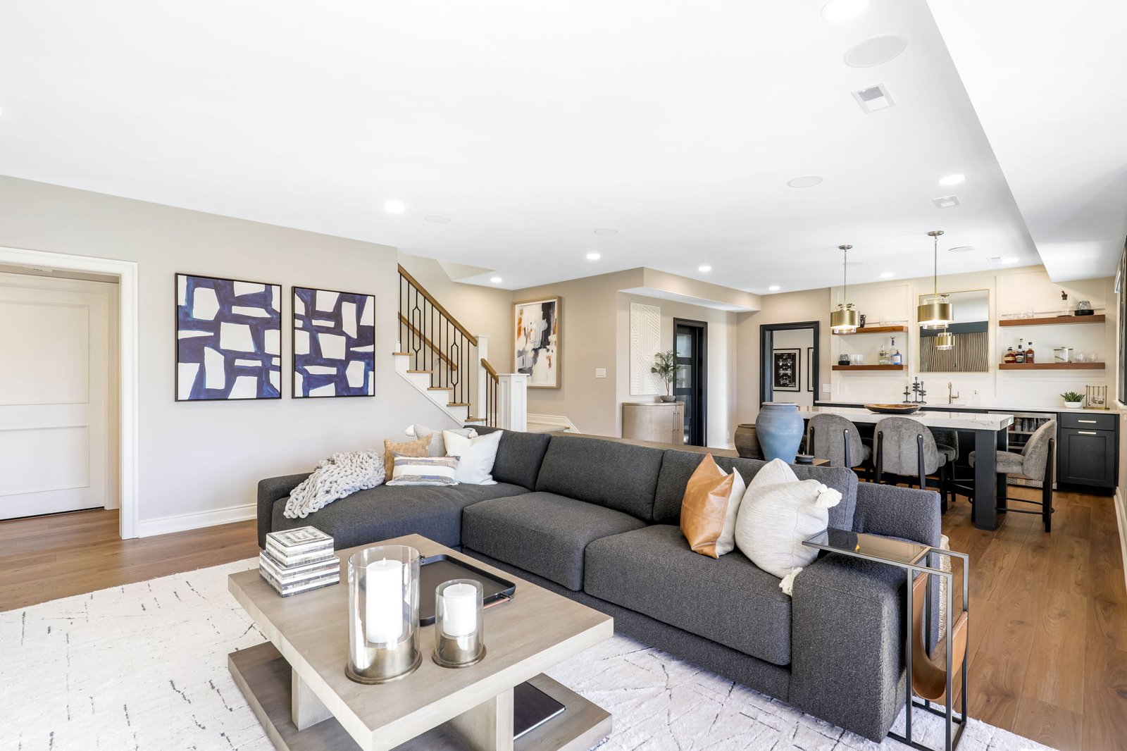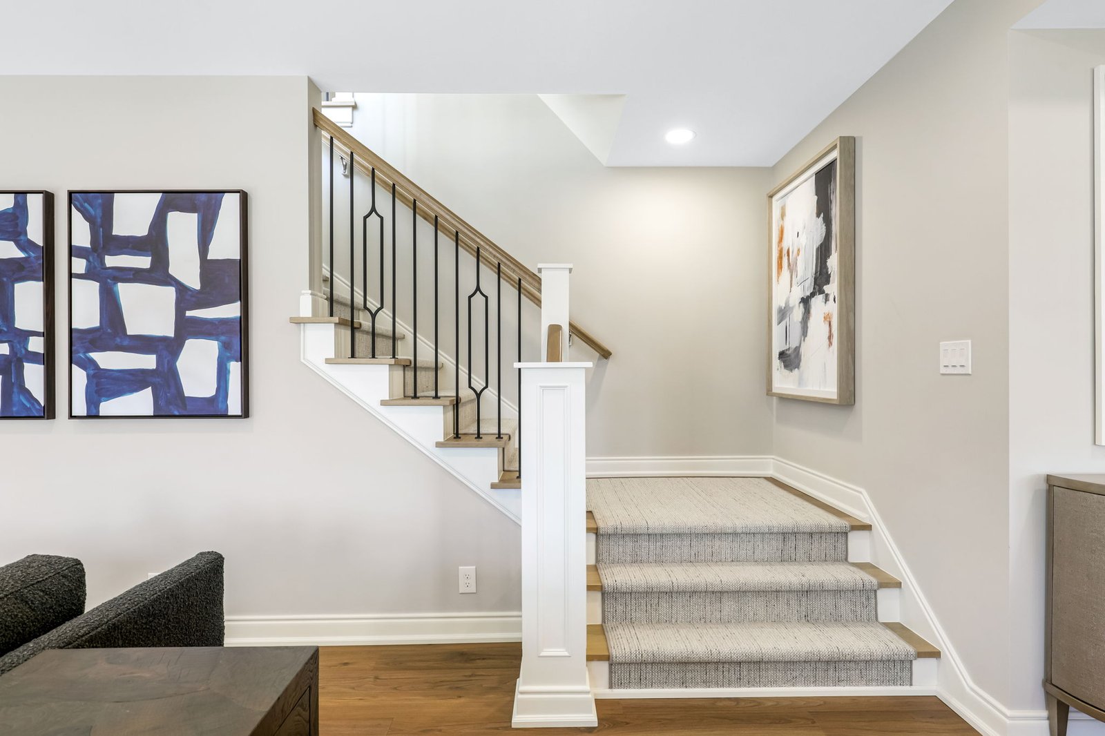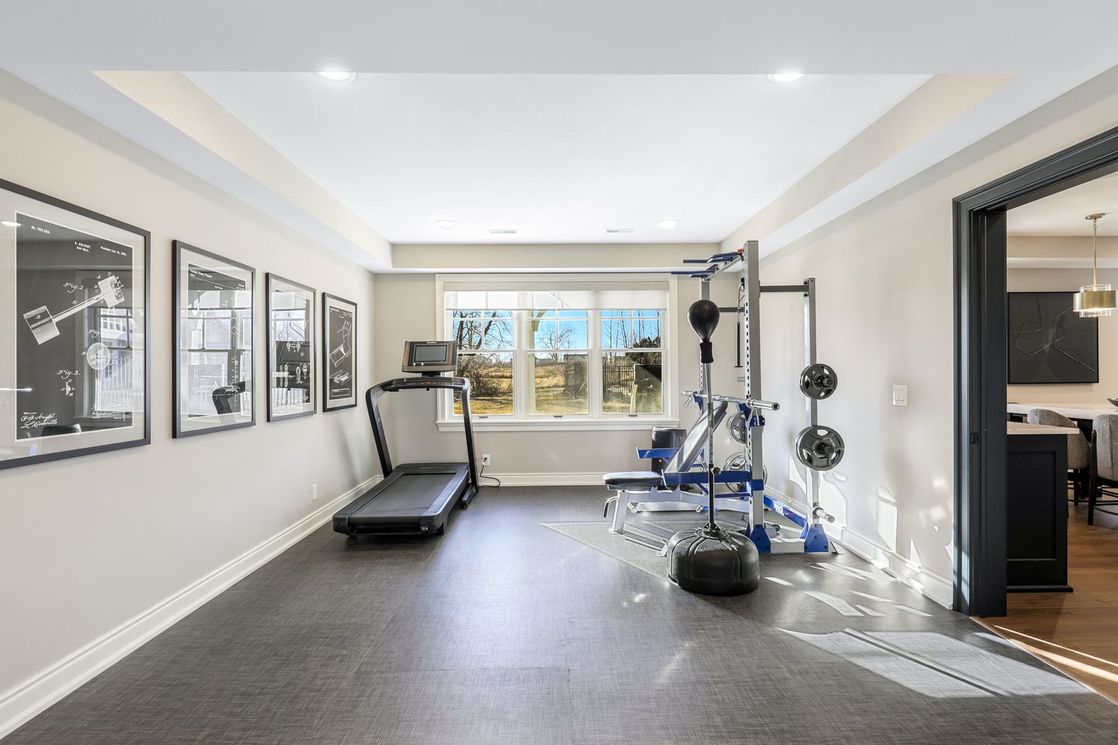 The lower level was transformed into a vibrant space for entertainment and relaxation. A sleek bar with black cabinetry and modern lighting offers the perfect setting for hosting. In the exercise room, a wood slat accent wall adds warmth and character. This level also includes a cozy living room, a guest bedroom, and an updated bathroom, creating a versatile area for family use.
