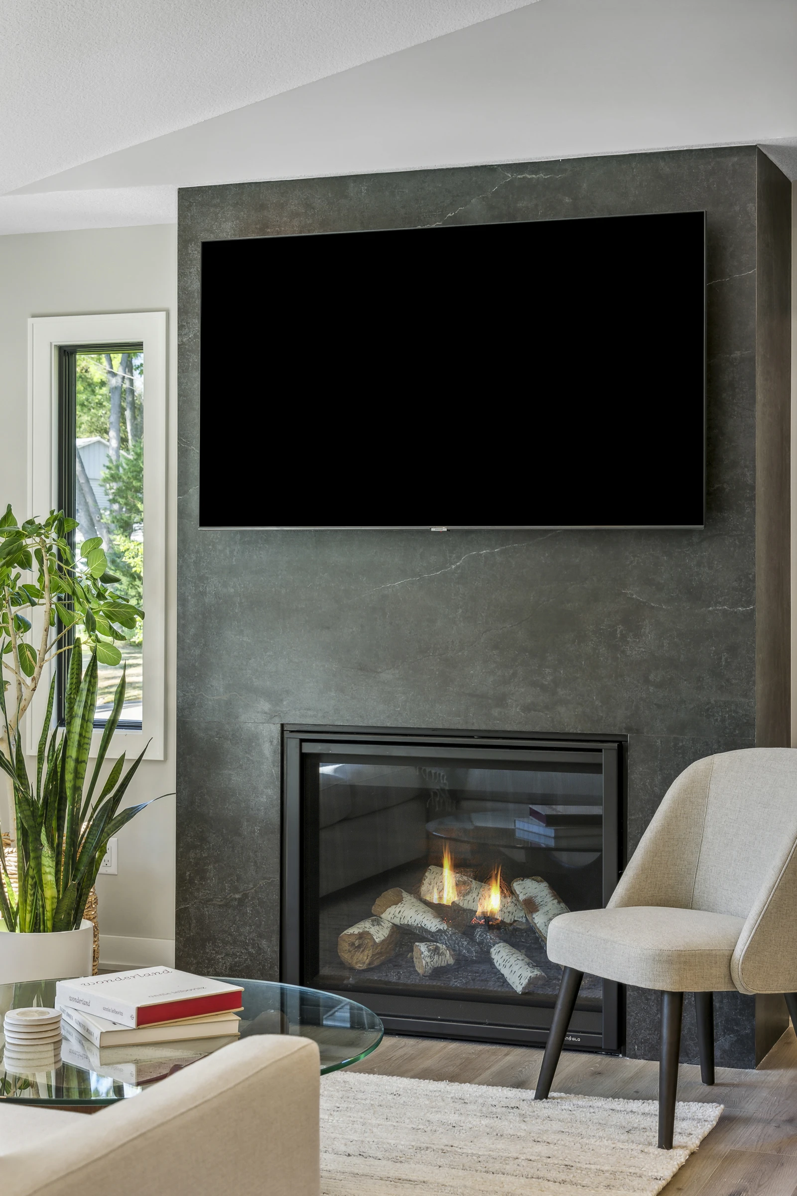 Adjacent to the kitchen, the fireplace was converted to gas and given a modern update with Dekton cladding, creating a sleek yet warm focal point in the living area. This upgrade enhances the cozy ambiance while complementing the home’s modern aesthetic.