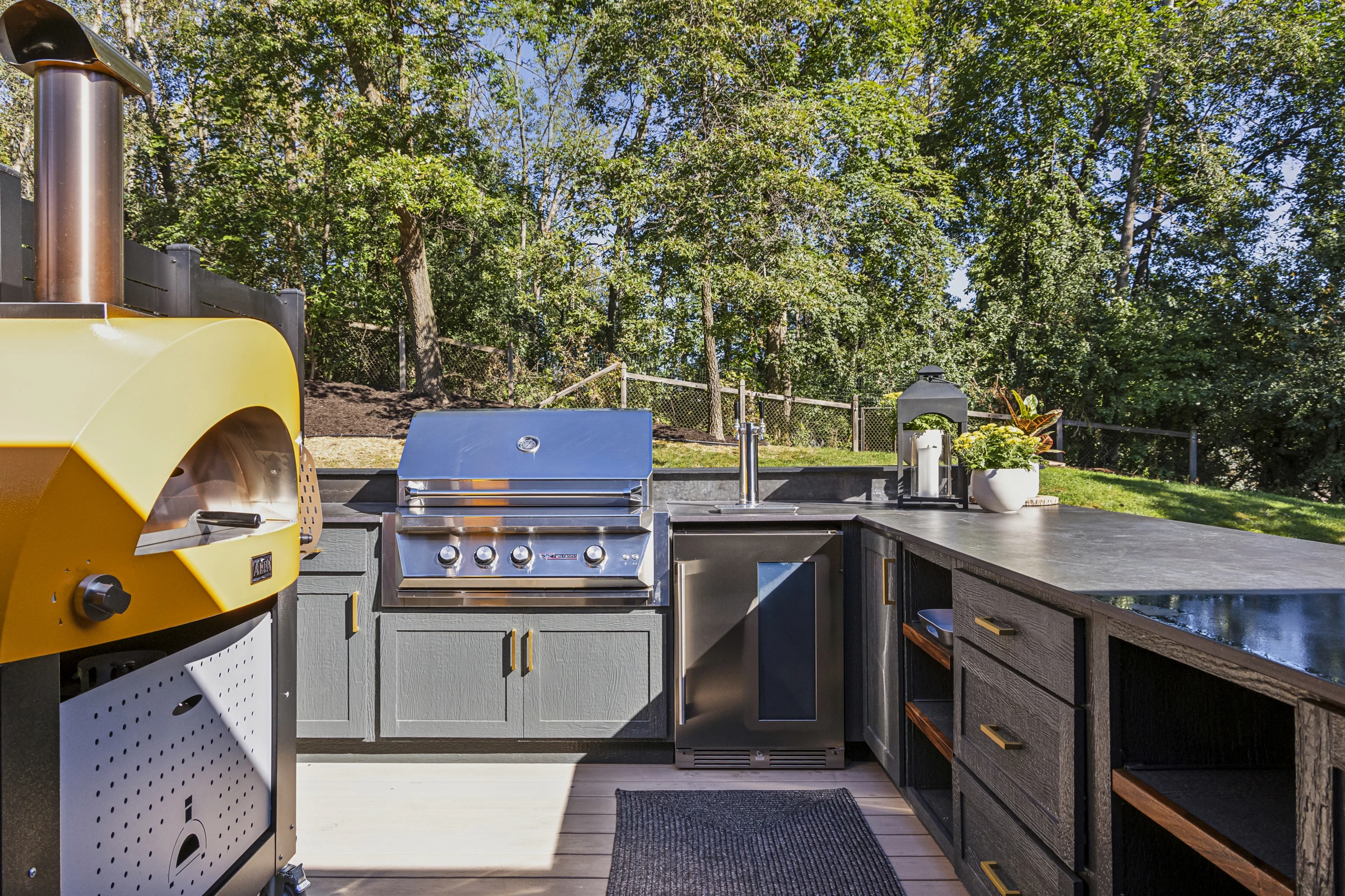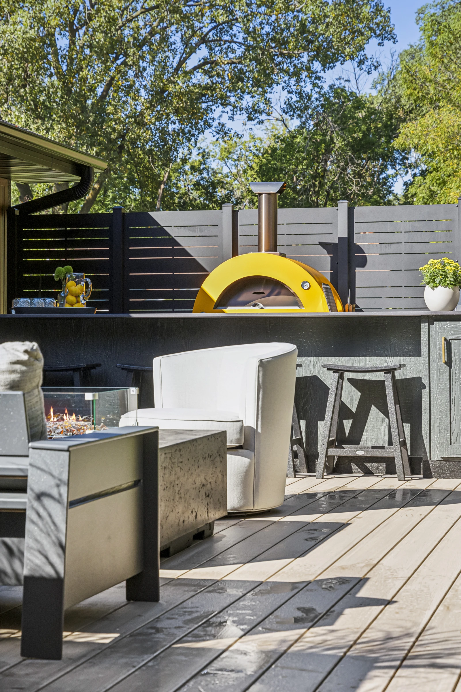 The deck renovation enhances the home’s connection to the outdoors, with easy flow from the kitchen to a beautifully designed outdoor space. The deck is built for year-round enjoyment, featuring Dekton countertops, which are UV-resistant and highly durable. It also boasts a Twin Eagles 42-inch grill, Alfa Moderno Pizza Oven, and a built-in kegorator, all elements that transform the deck into an ideal spot for outdoor entertaining.