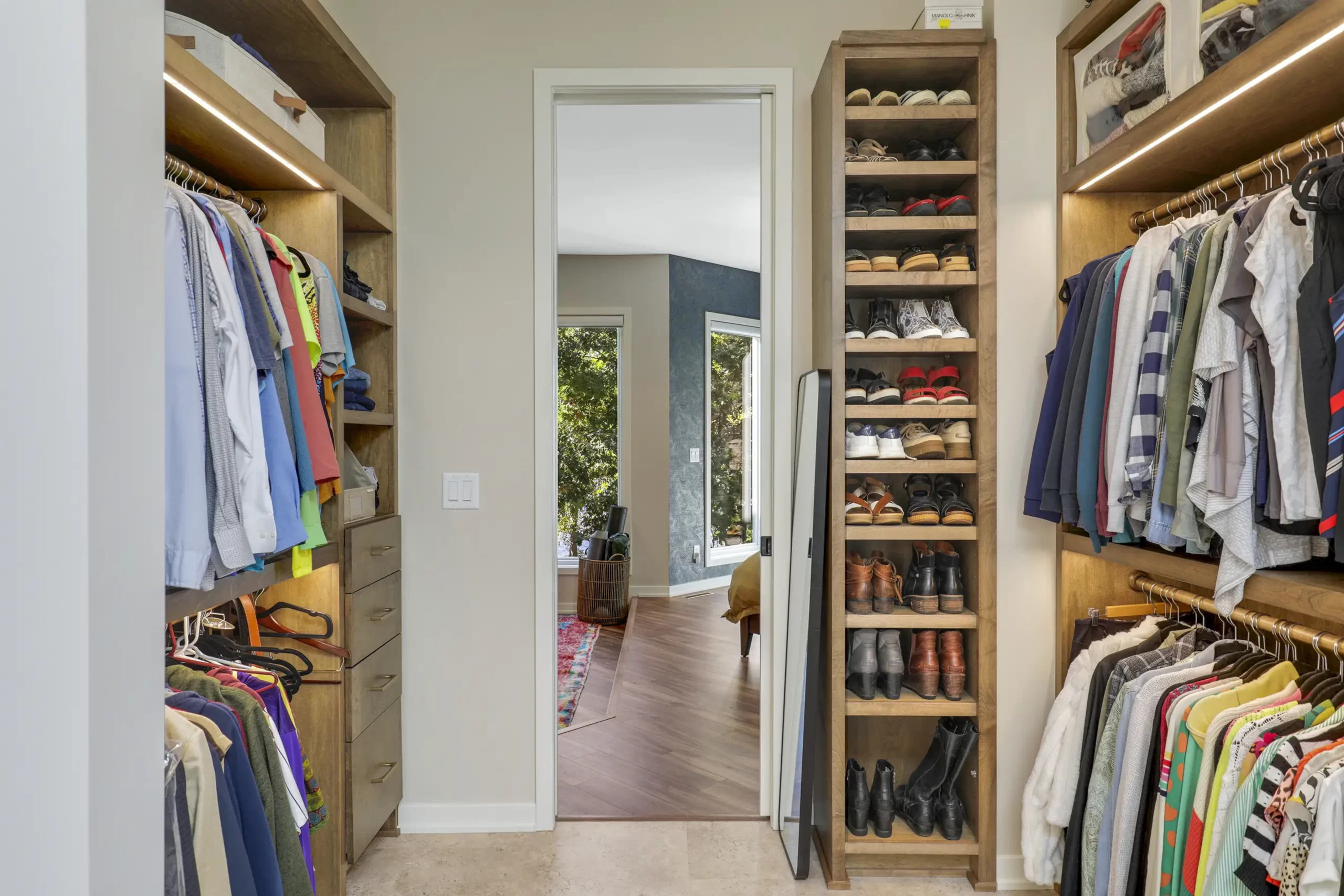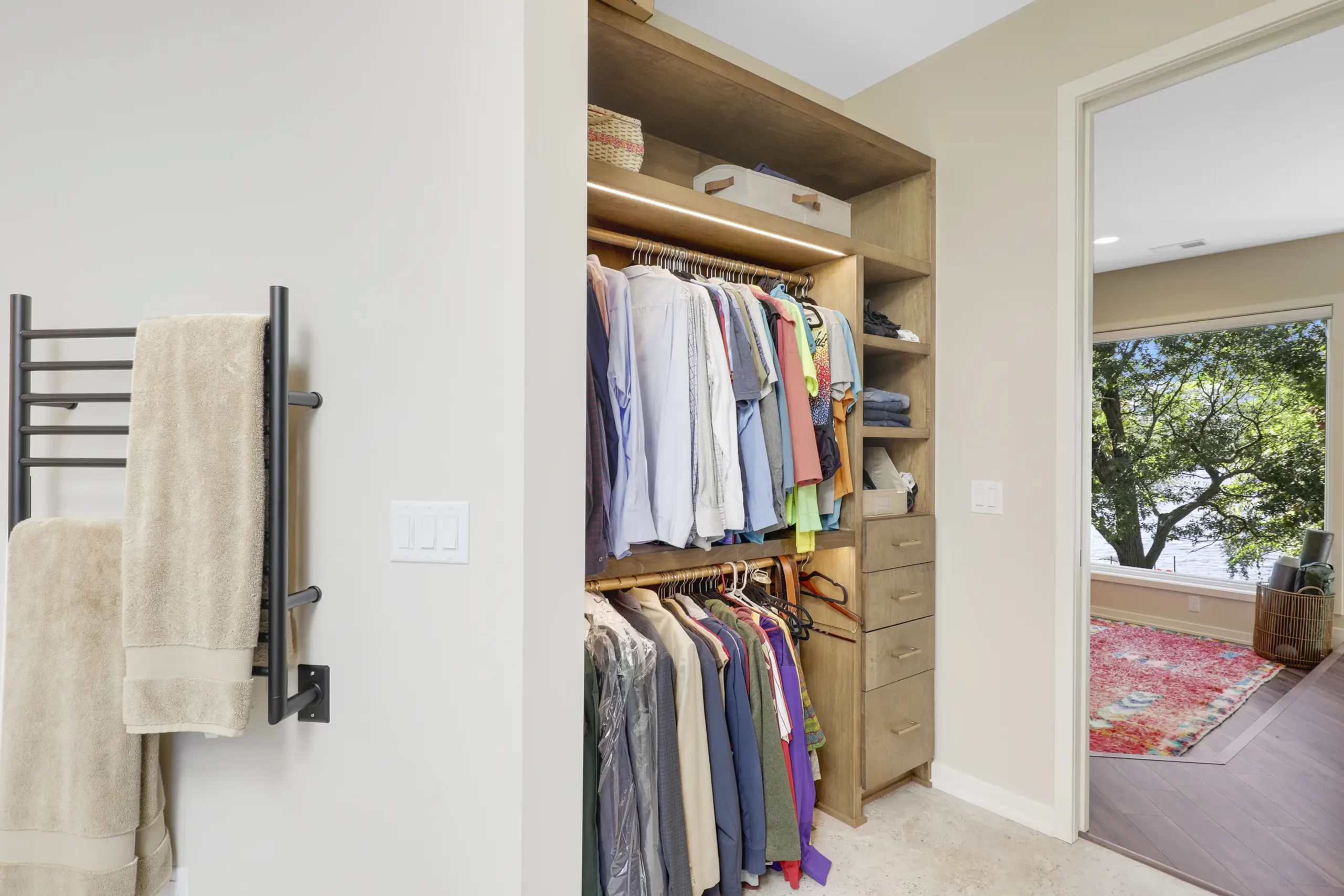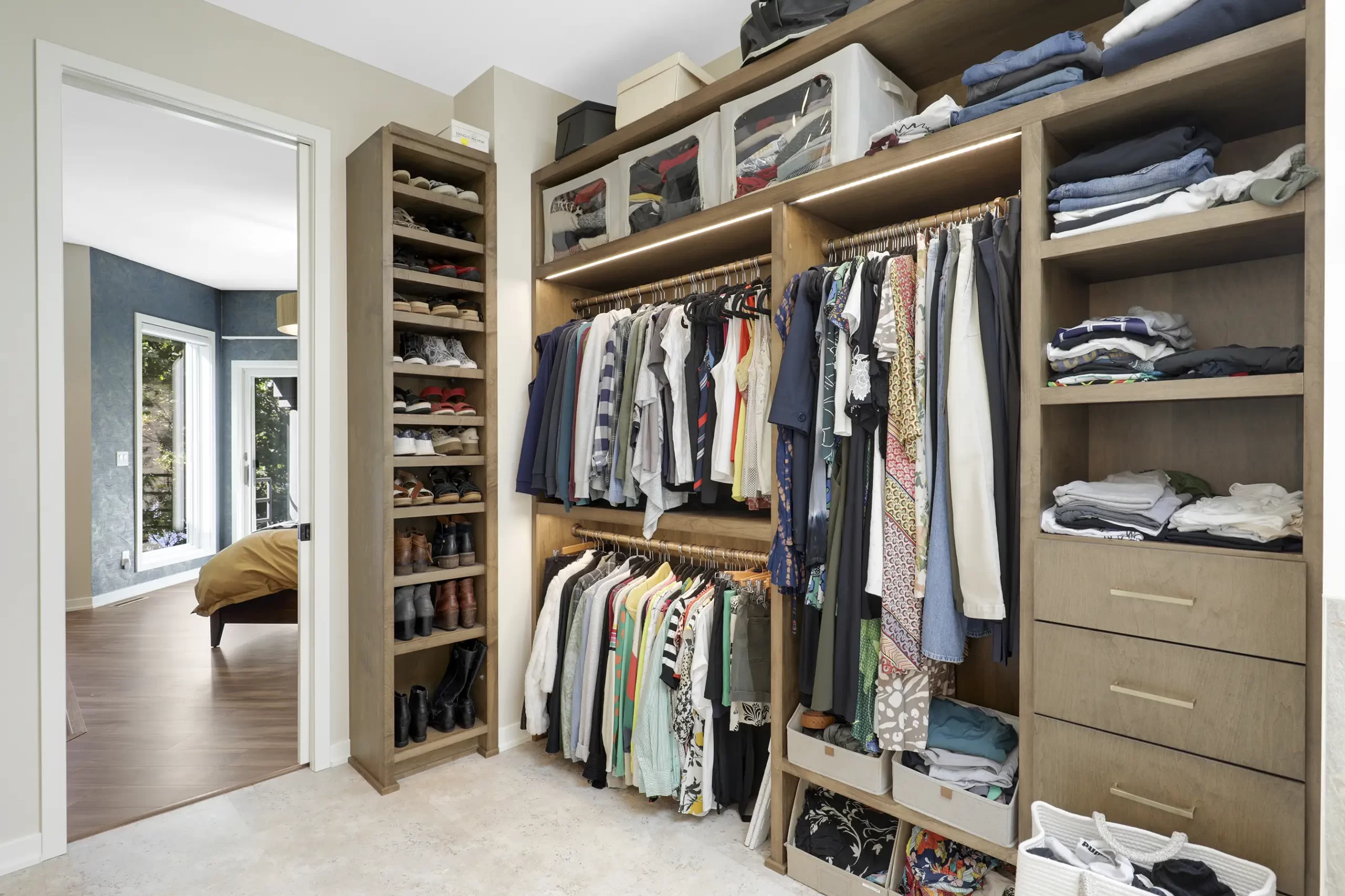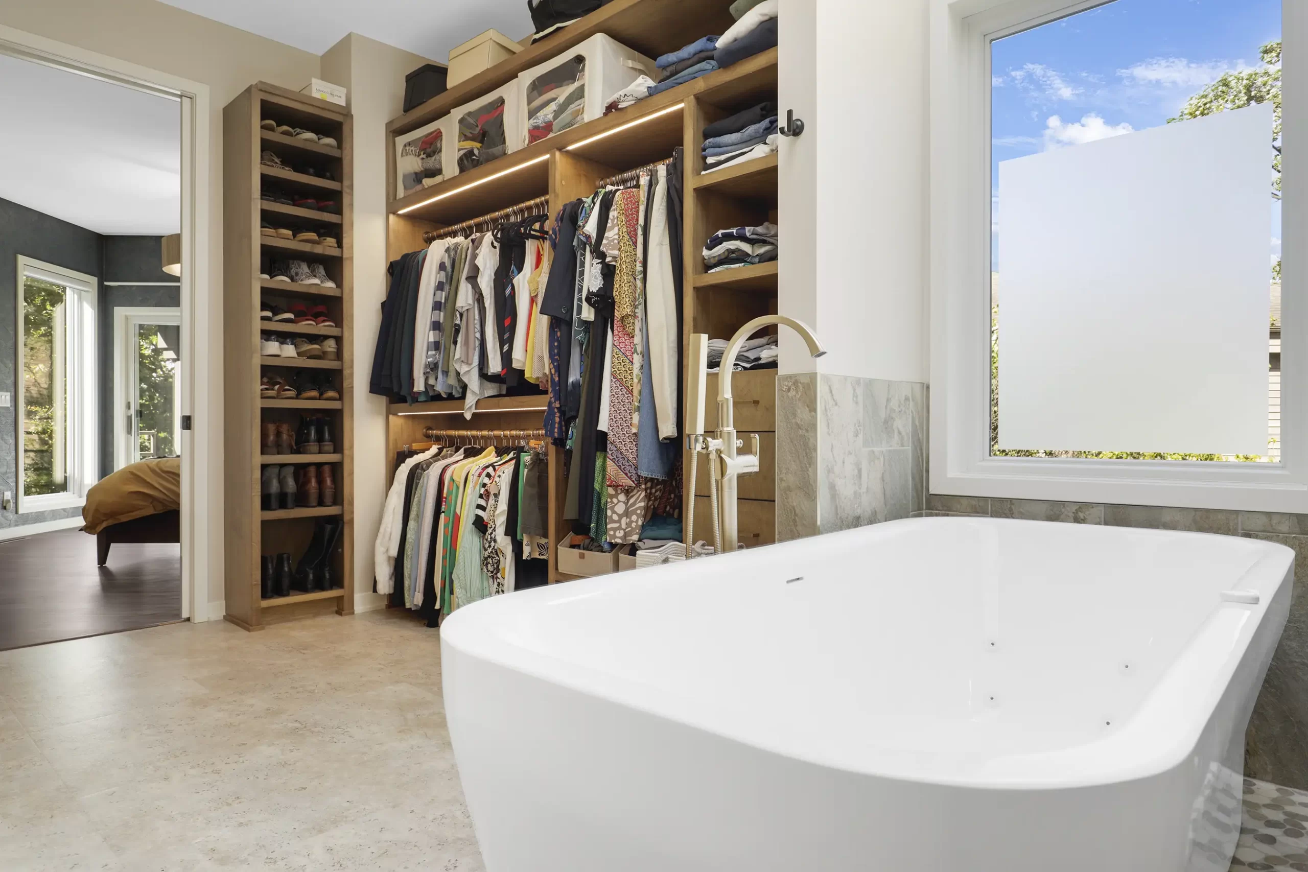 In the closet, the renovation expanded the floor space, creating a more spacious and integrated dressing area that flows naturally from the bedroom. Removing the closet doors added to the open feel of the suite, making it easier to access and utilize the space.