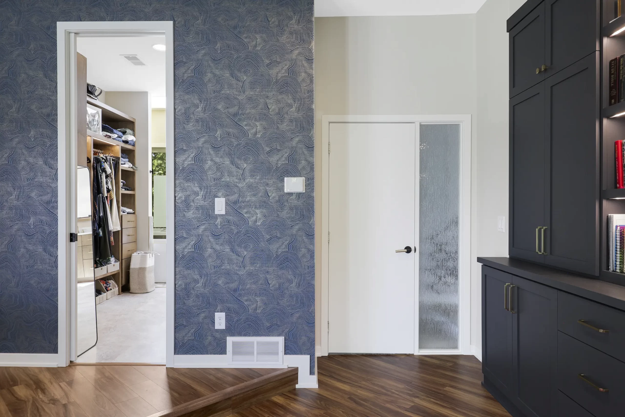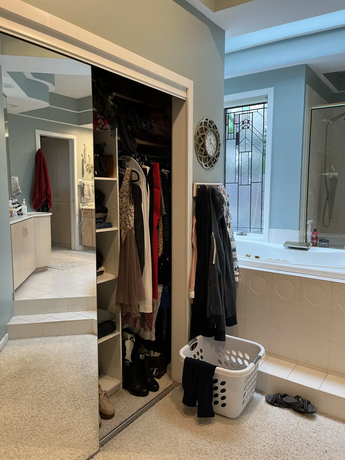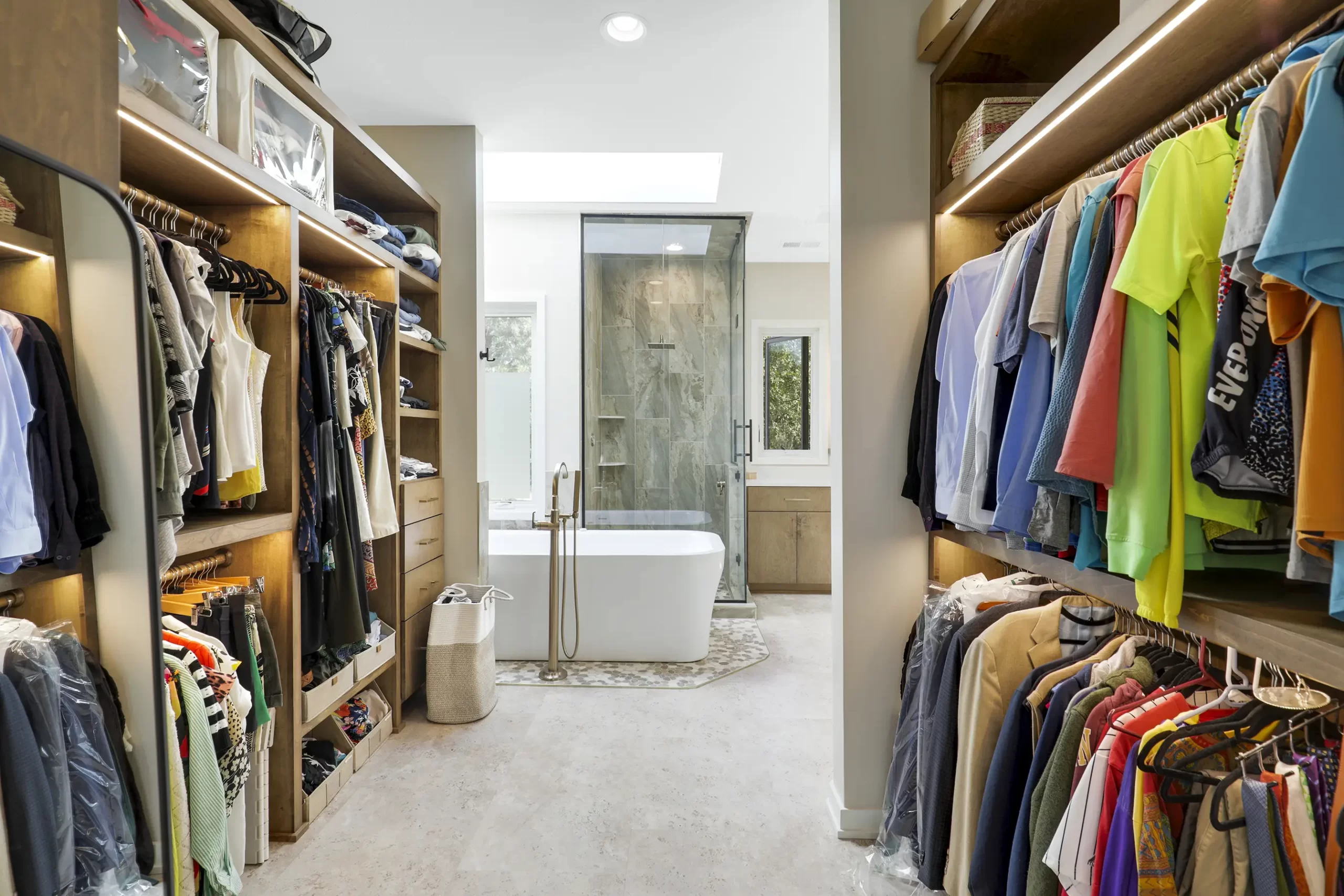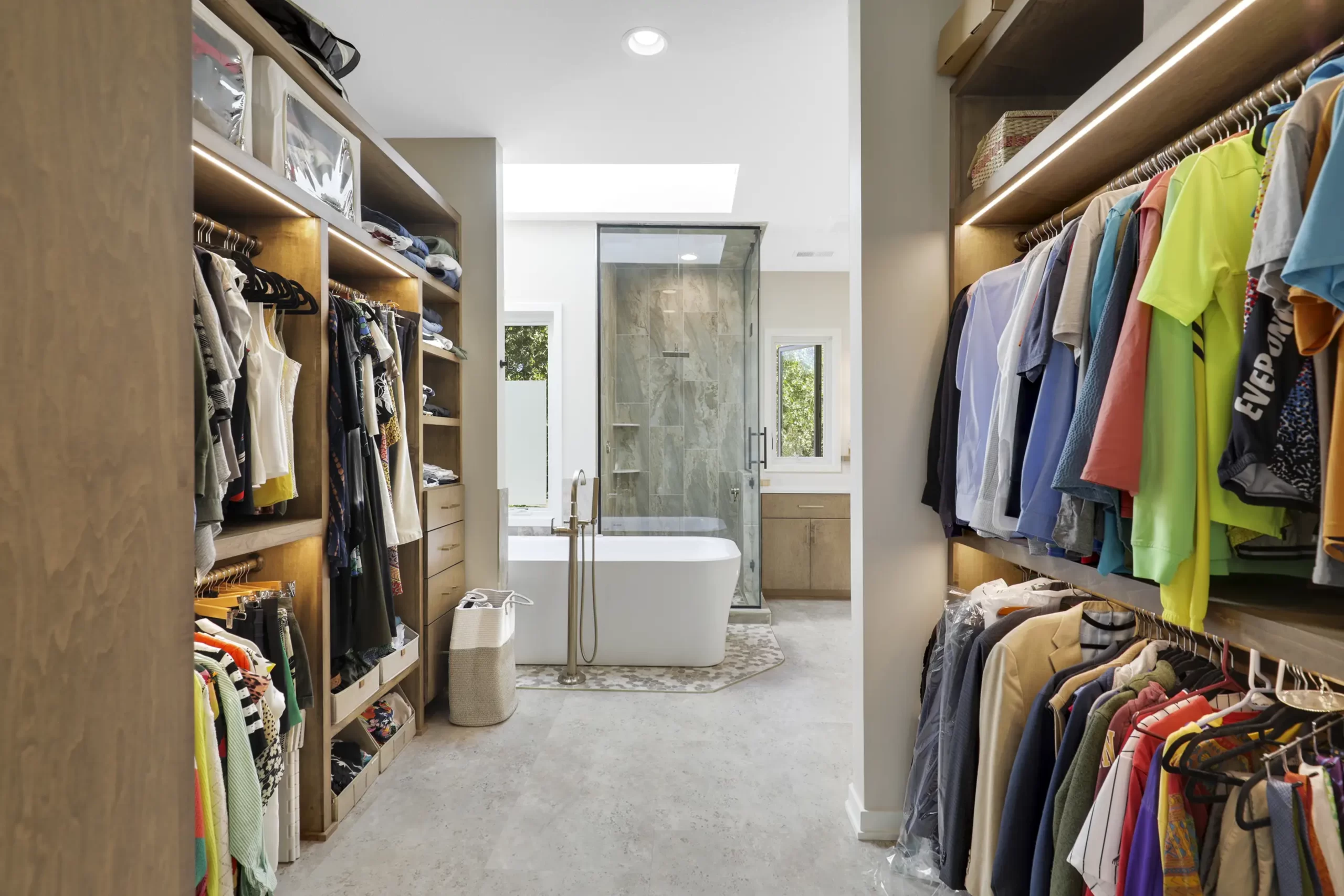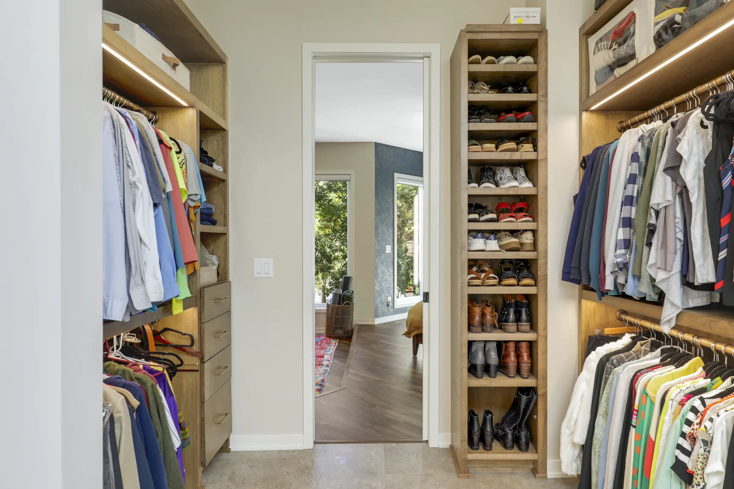 In the closet, the renovation expanded the floor space, creating a more spacious and integrated dressing area that flows naturally from the bedroom. Removing the closet doors added to the open feel of the suite, making it easier to access and utilize the space.