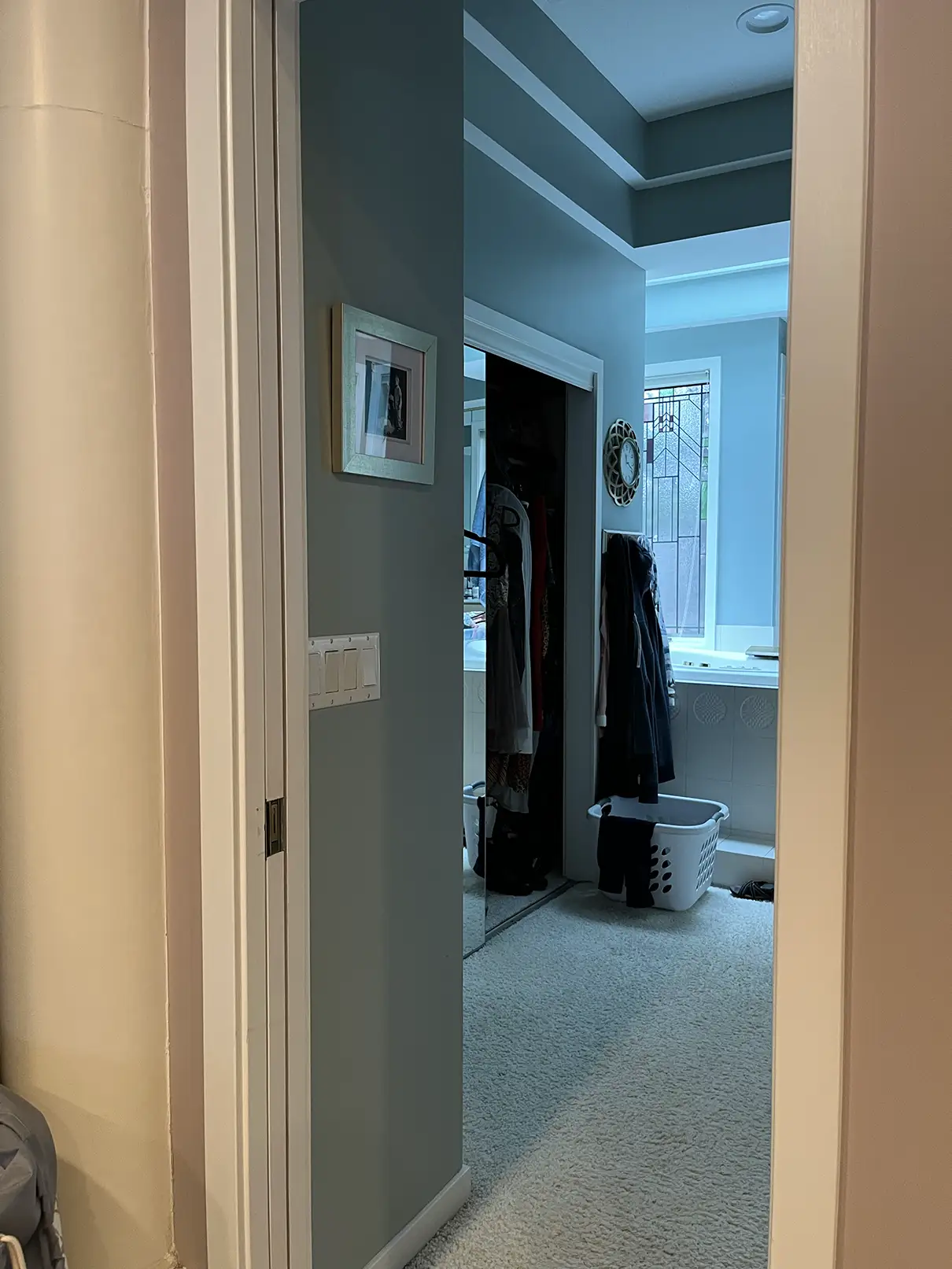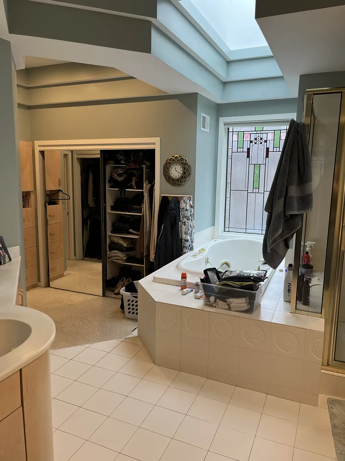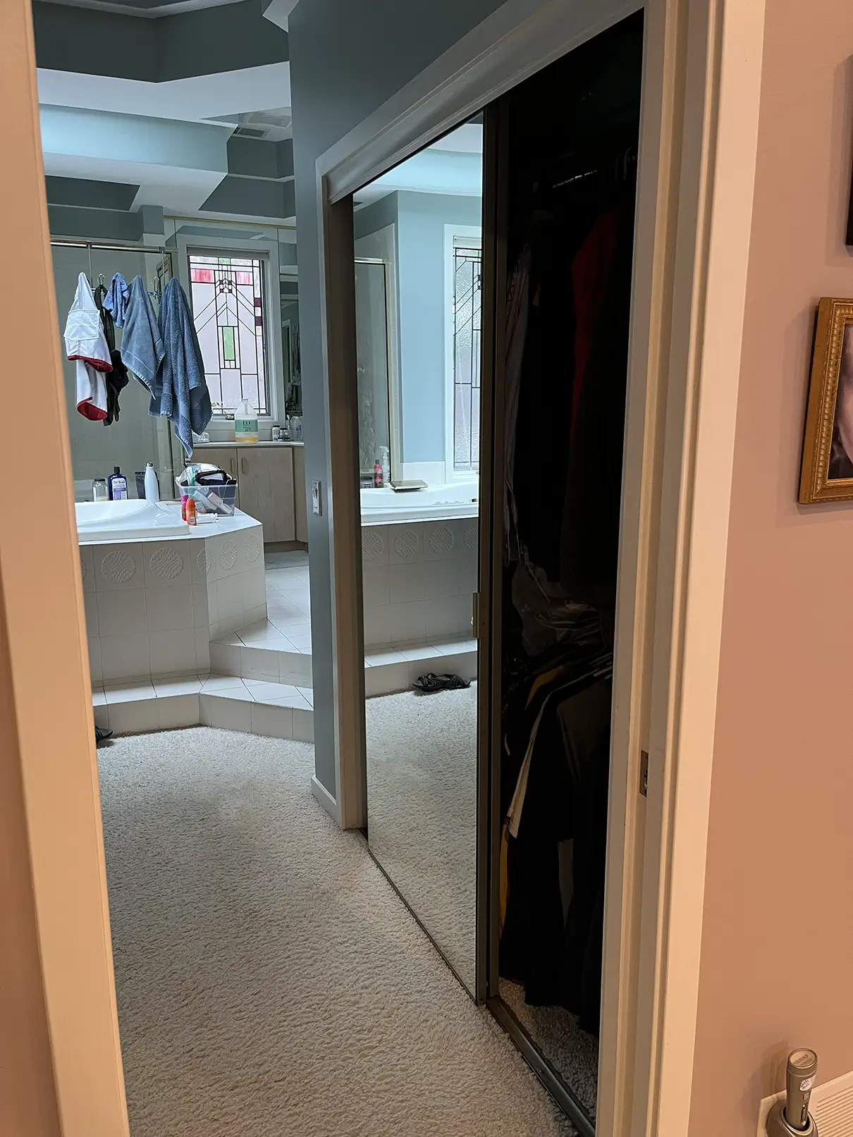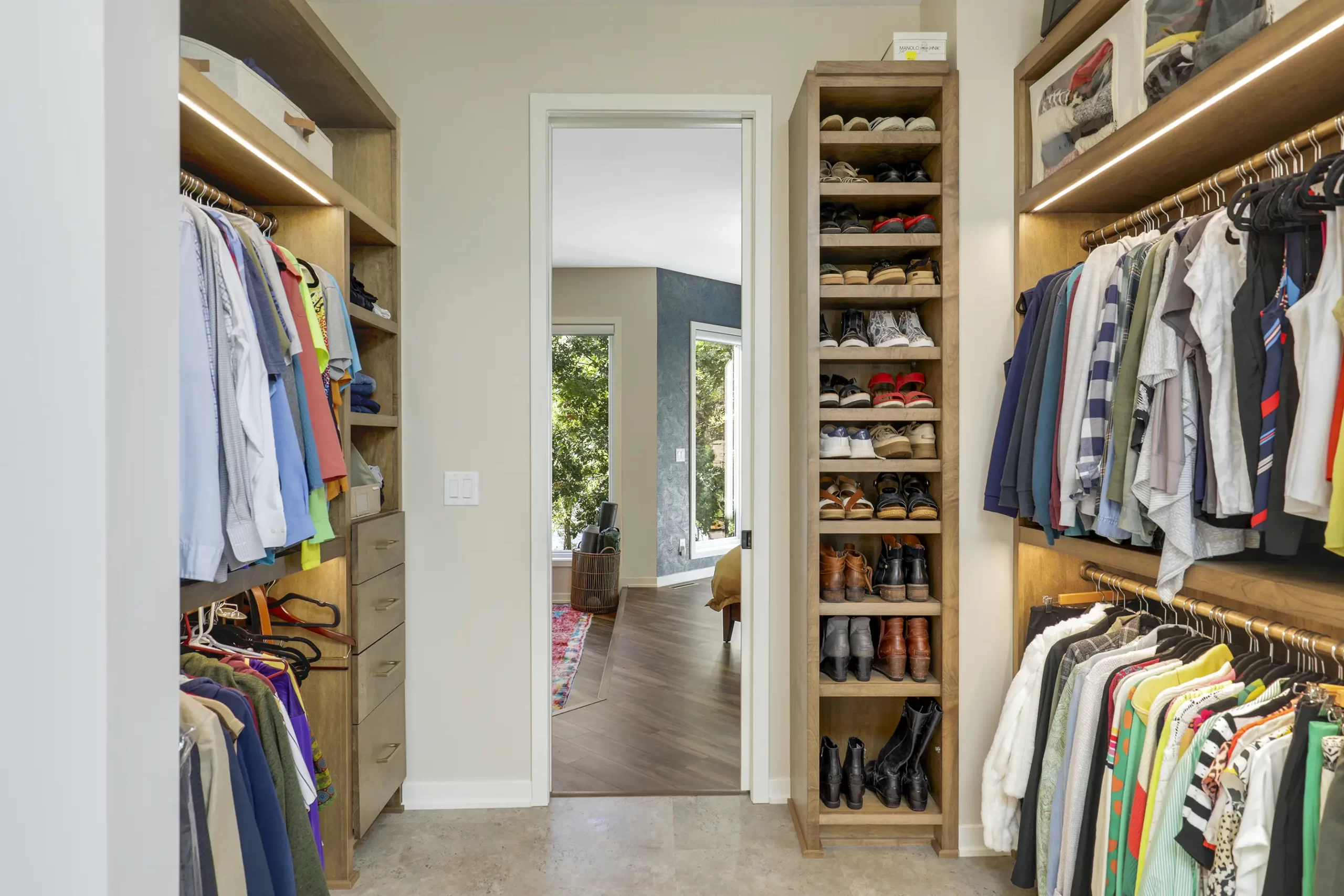 In the closet, the renovation expanded the floor space, creating a more spacious and integrated dressing area that flows naturally from the bedroom. Removing the closet doors added to the open feel of the suite, making it easier to access and utilize the space.