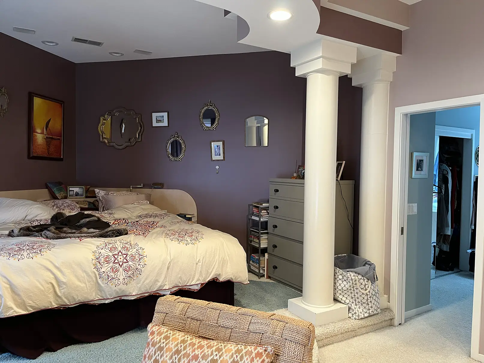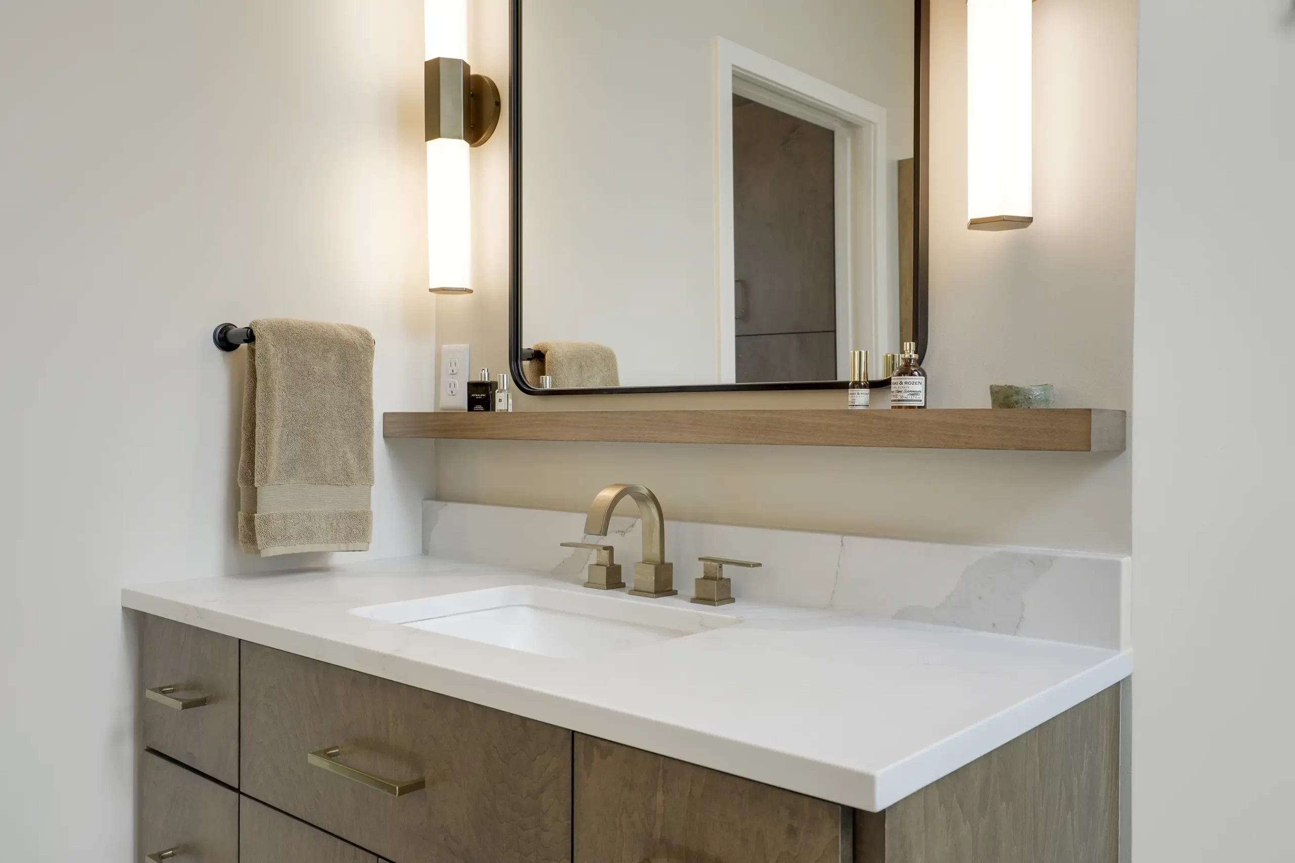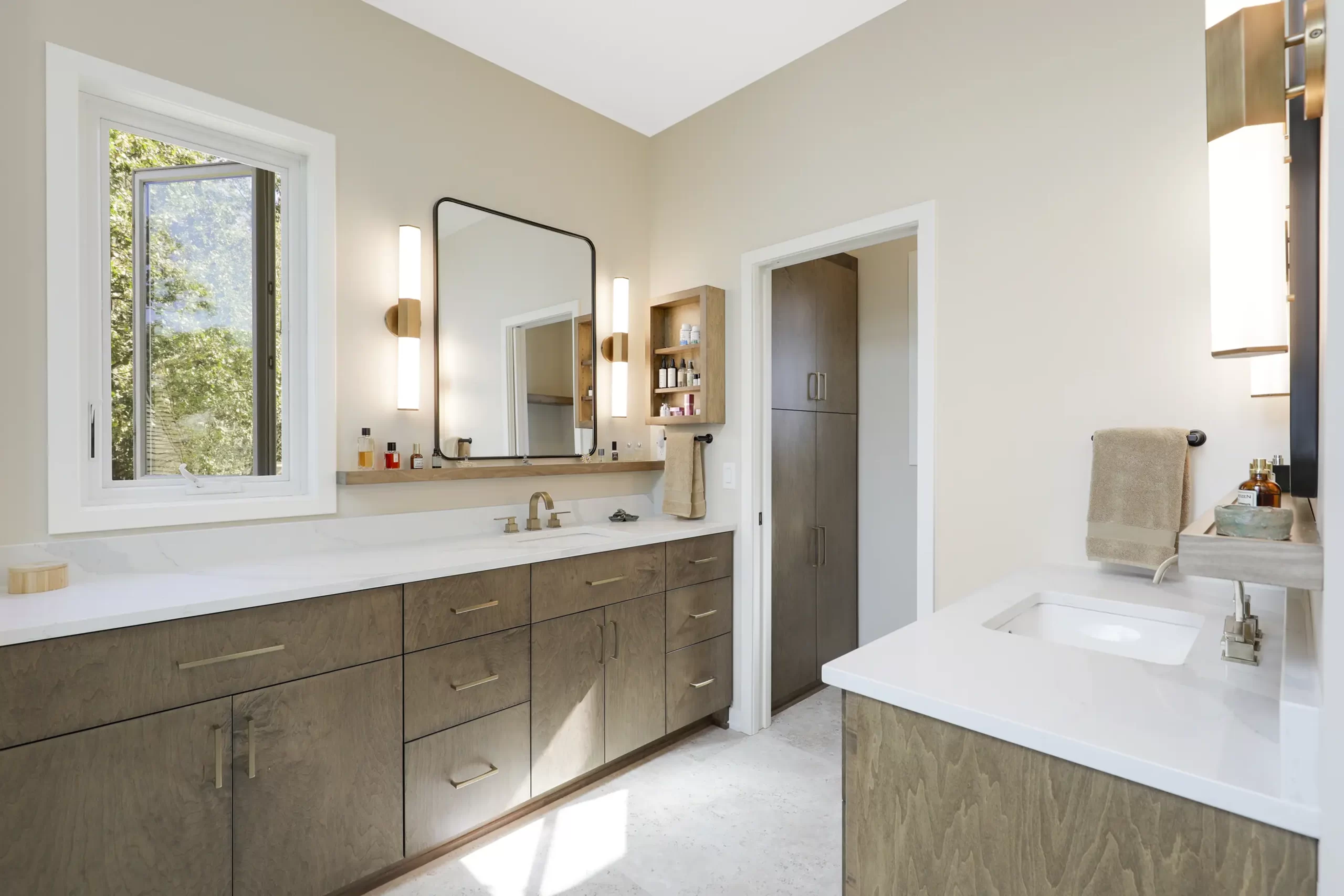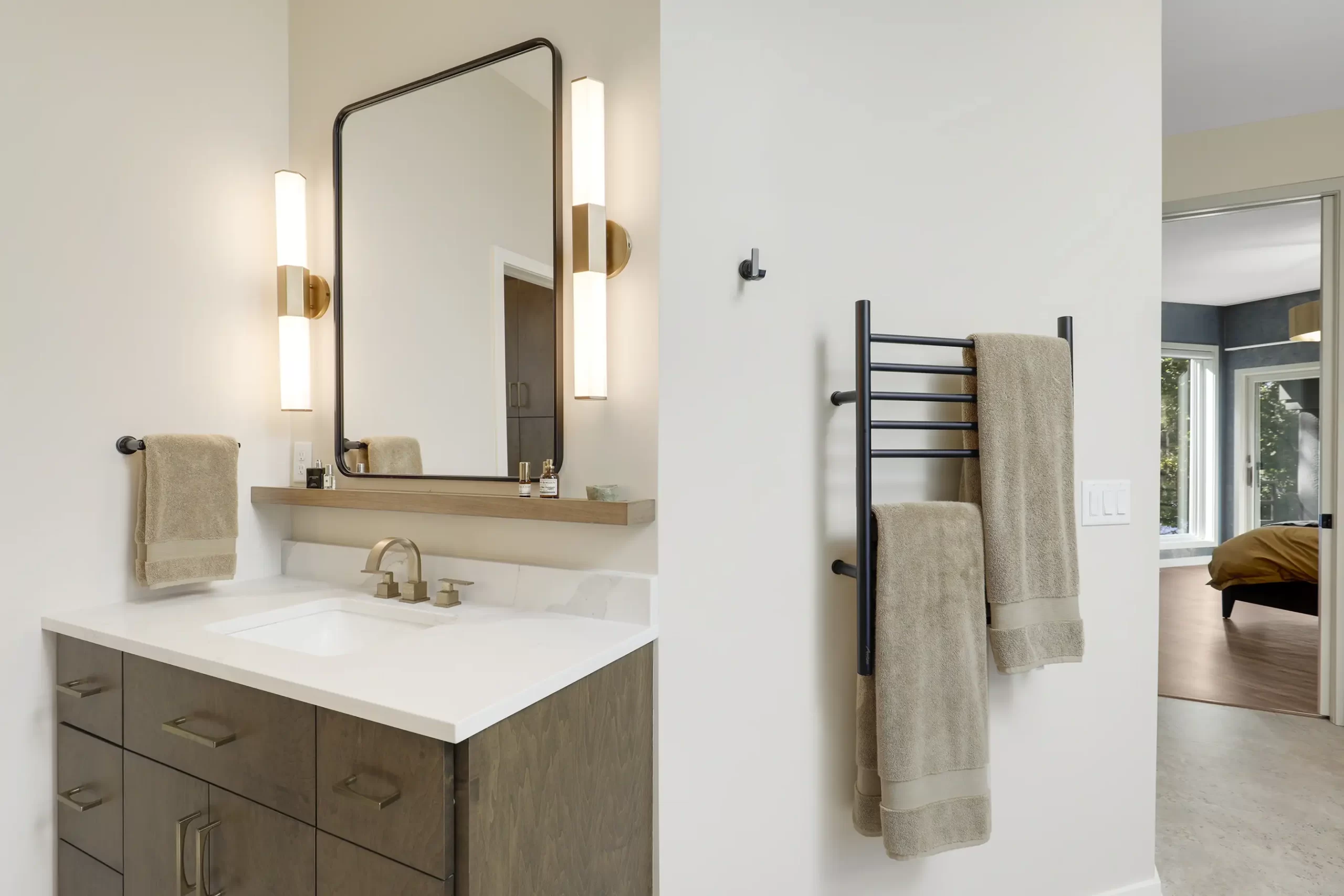 The bathroom underwent a significant transformation as well. The previous step-up design was removed, leveling the floor to create a more streamlined and accessible space. This change enhances the modern feel while providing a practical, user-friendly layout. New tile, updated plumbing fixtures, and sleek vanities further elevate the bathroom’s design.