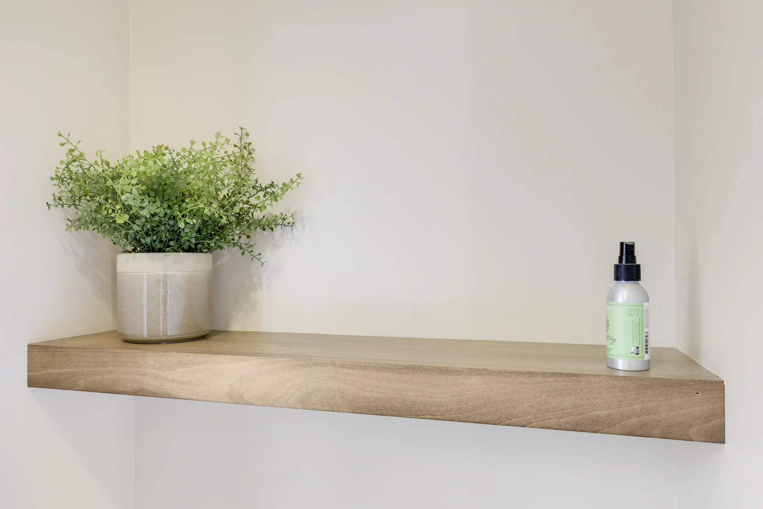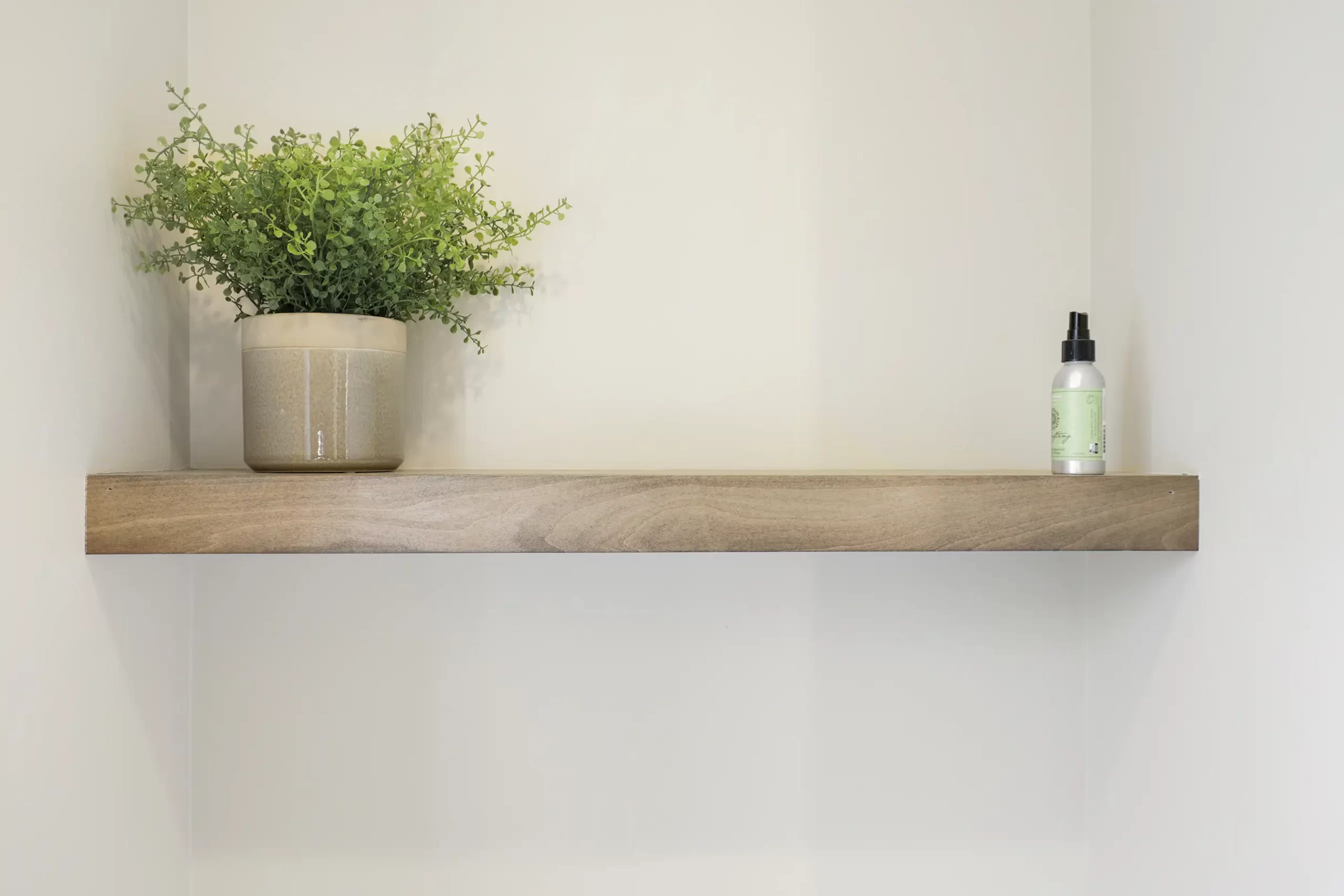 In the bedroom, the outdated purple hues and worn carpet were replaced with elegant LVT flooring in the Arrado style. The fine grain detail of this mid to dark brown timber flooring, accented with hints of blonde, adds warmth and richness to the room, creating a cozy yet modern feel. The new flooring ties seamlessly into the seating area, offering a perfect spot to relax and enjoy the serene river views.
