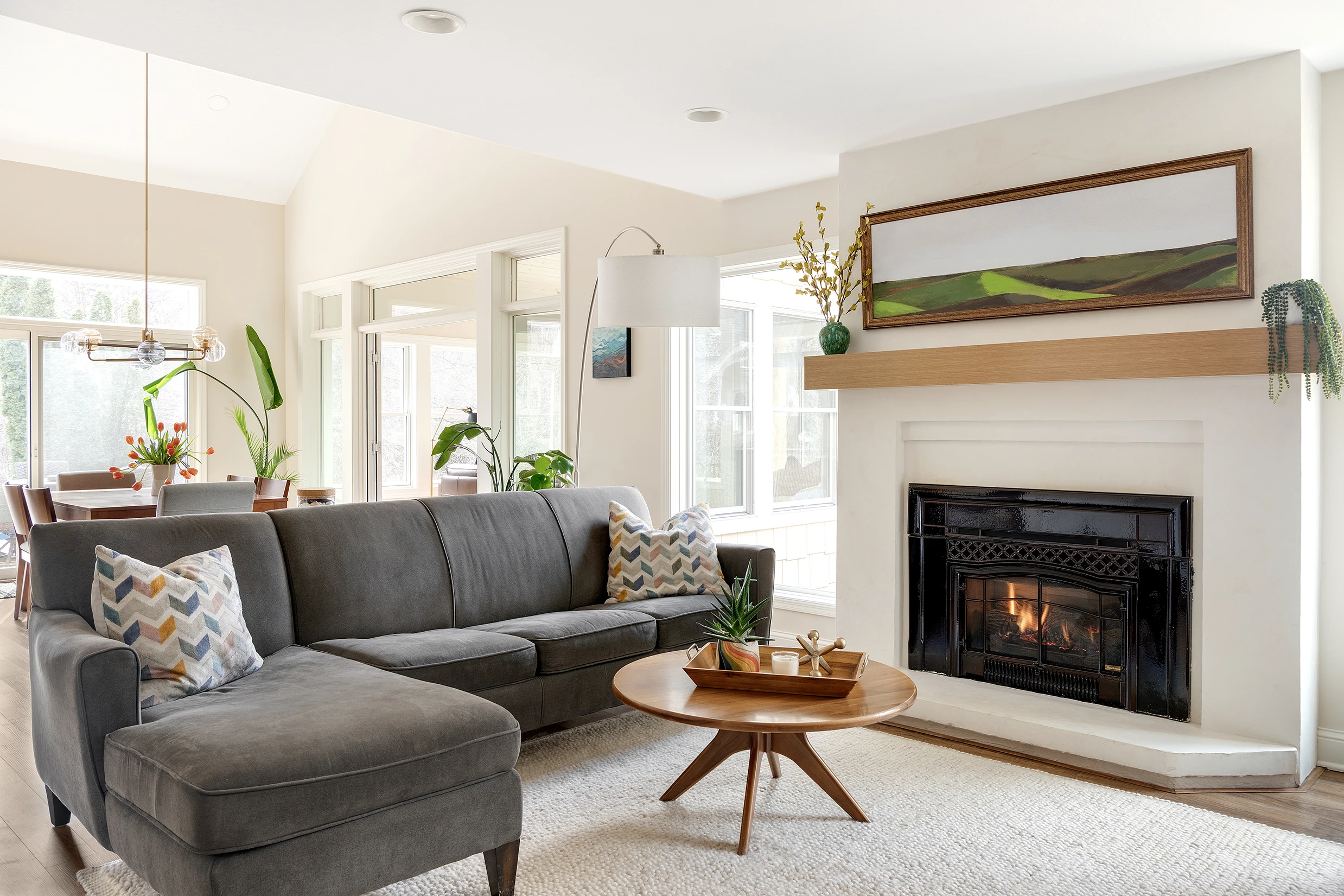 The transformation includes a stunning four-season porch addition with expansive views of the lake, a completely reconfigured kitchen layout, and updated finishes throughout. Custom cabinetry, quartz countertops, and high-end fixtures elevate the kitchen, now seamlessly connected to the new living space for effortless entertaining and everyday life.