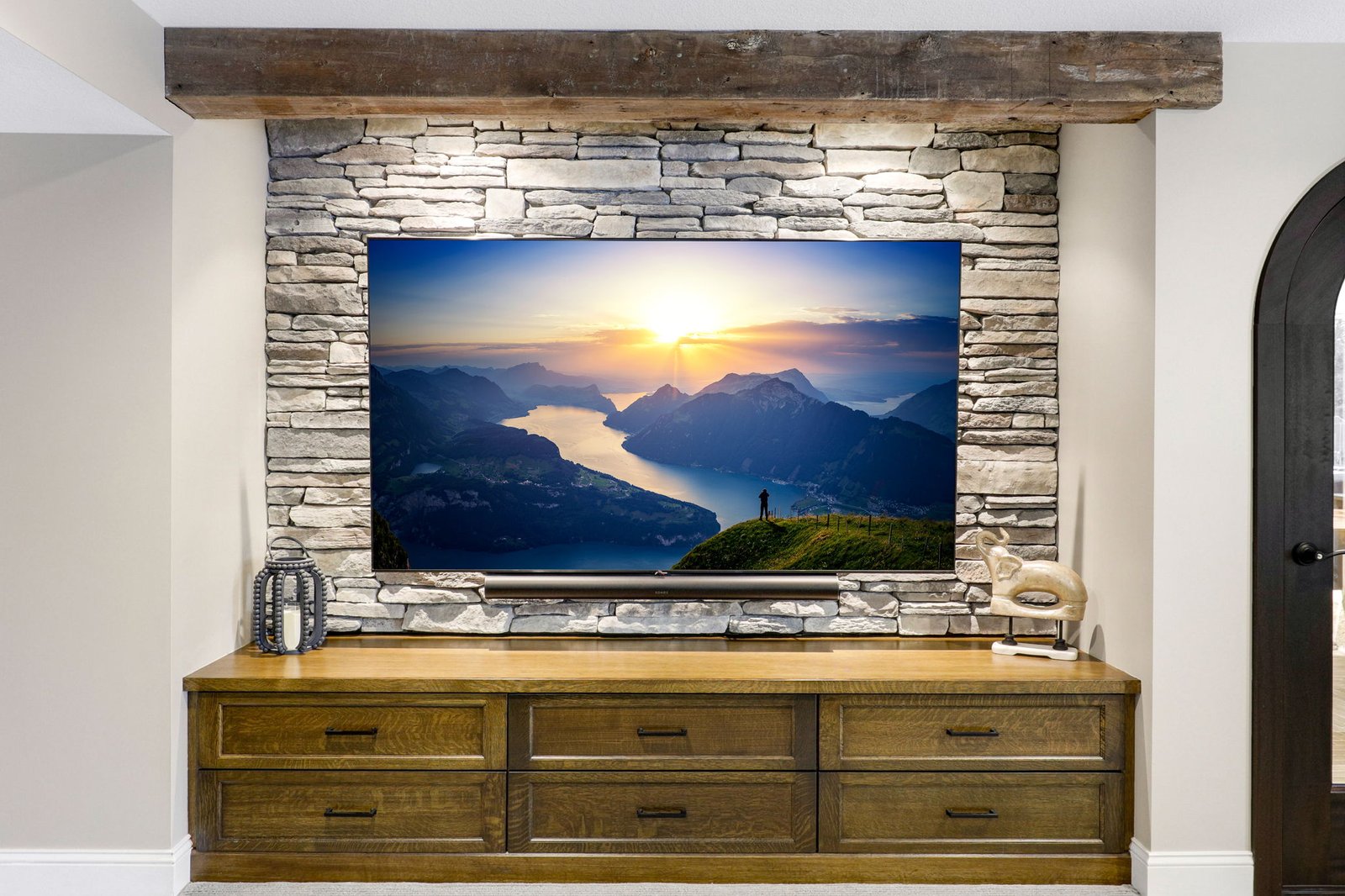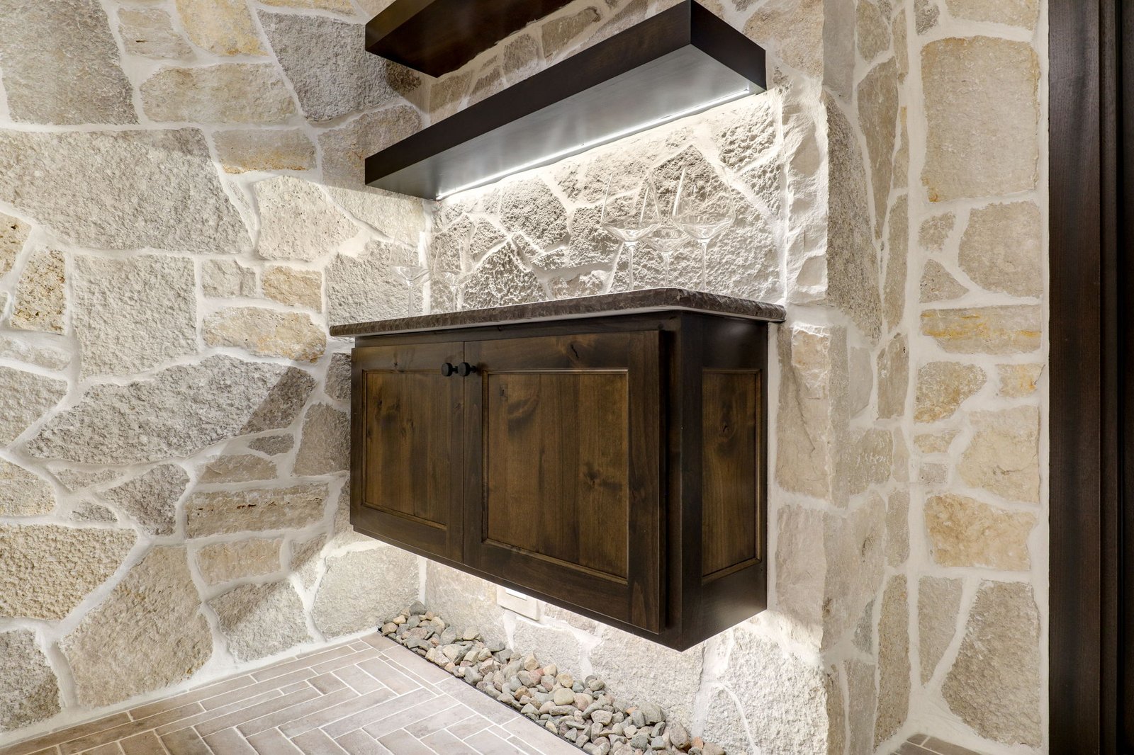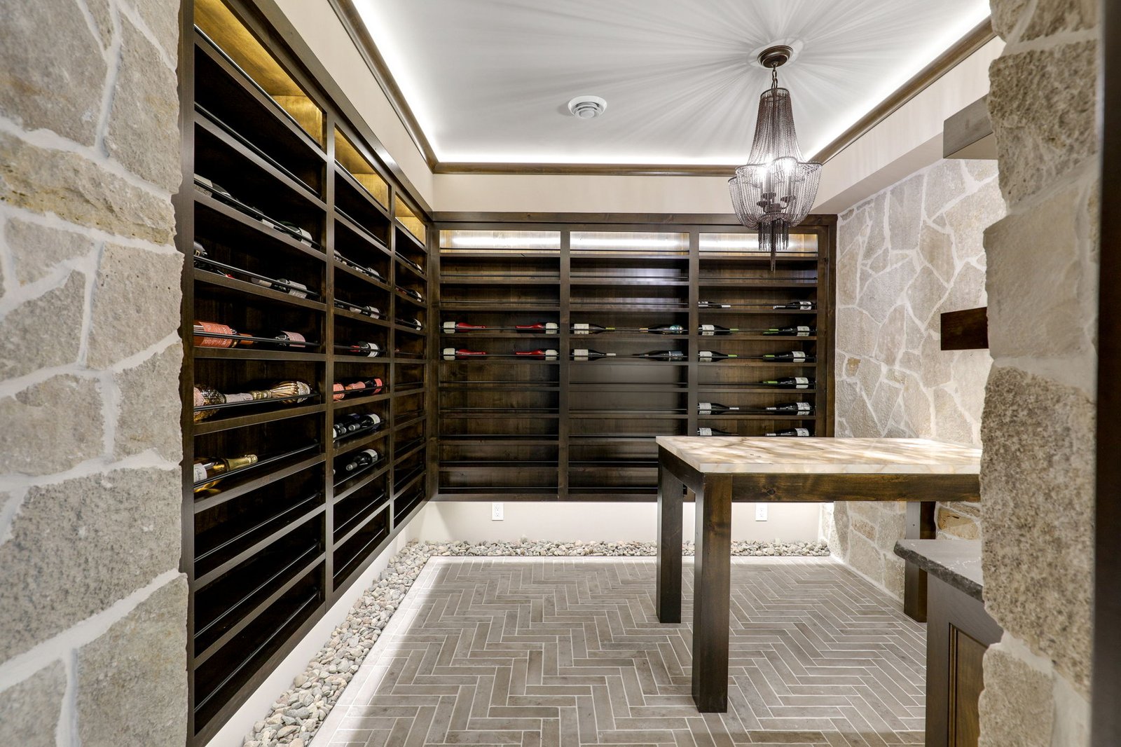 The renovation focused on more than just functionality. We infused the space with an ‘old world’ charm, incorporating rich wood tones, a stone web wall, and brick-style herringbone tiles. Additionally, a custom arched wine door helps regulate the room’s temperature while enhancing the historic feel. Modern lighting features were thoughtfully integrated, allowing the ambiance to be adjusted for any occasion. The result is a luxurious retreat within the home.