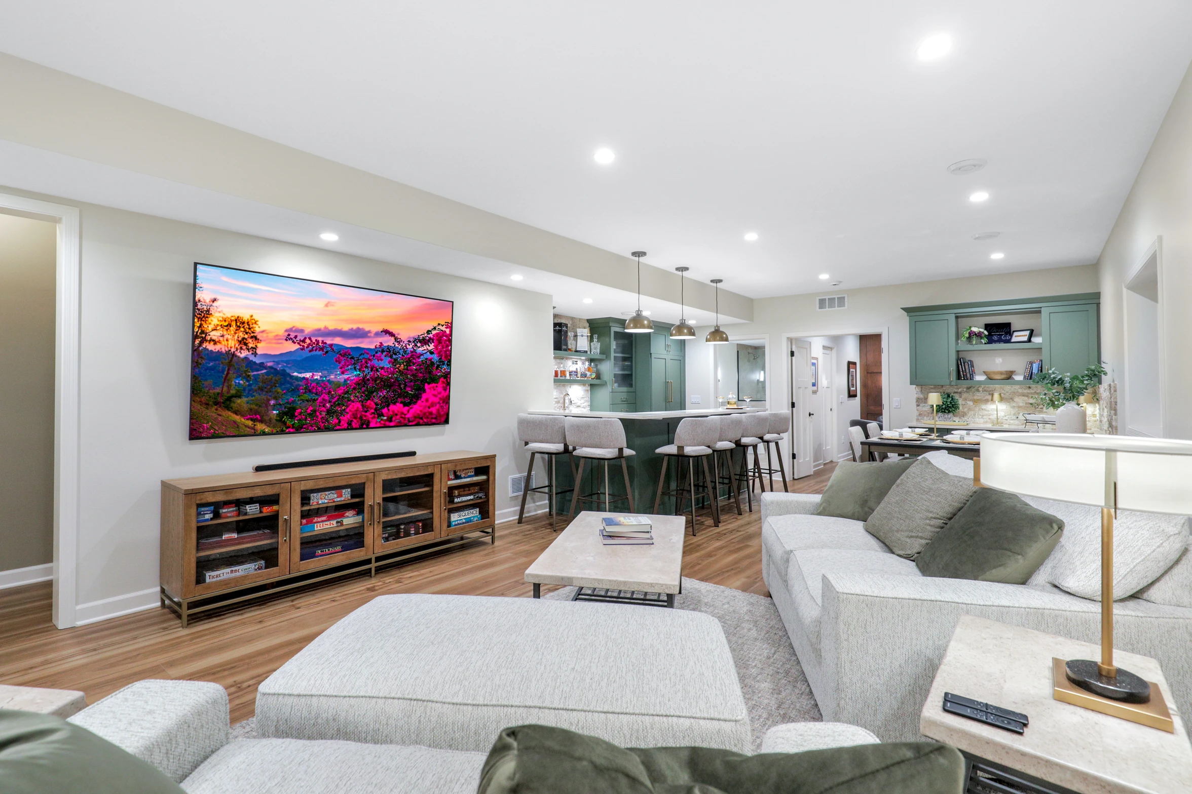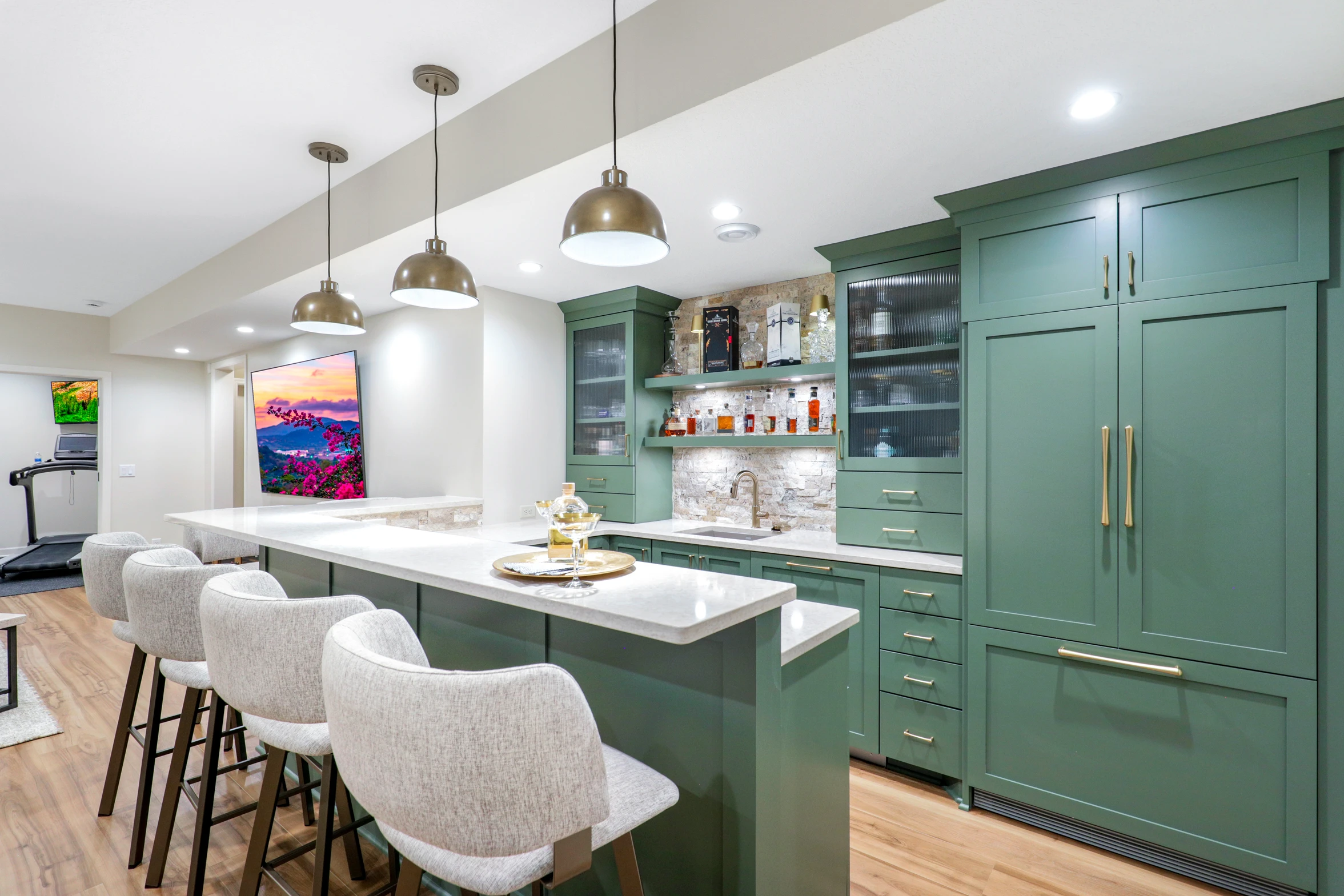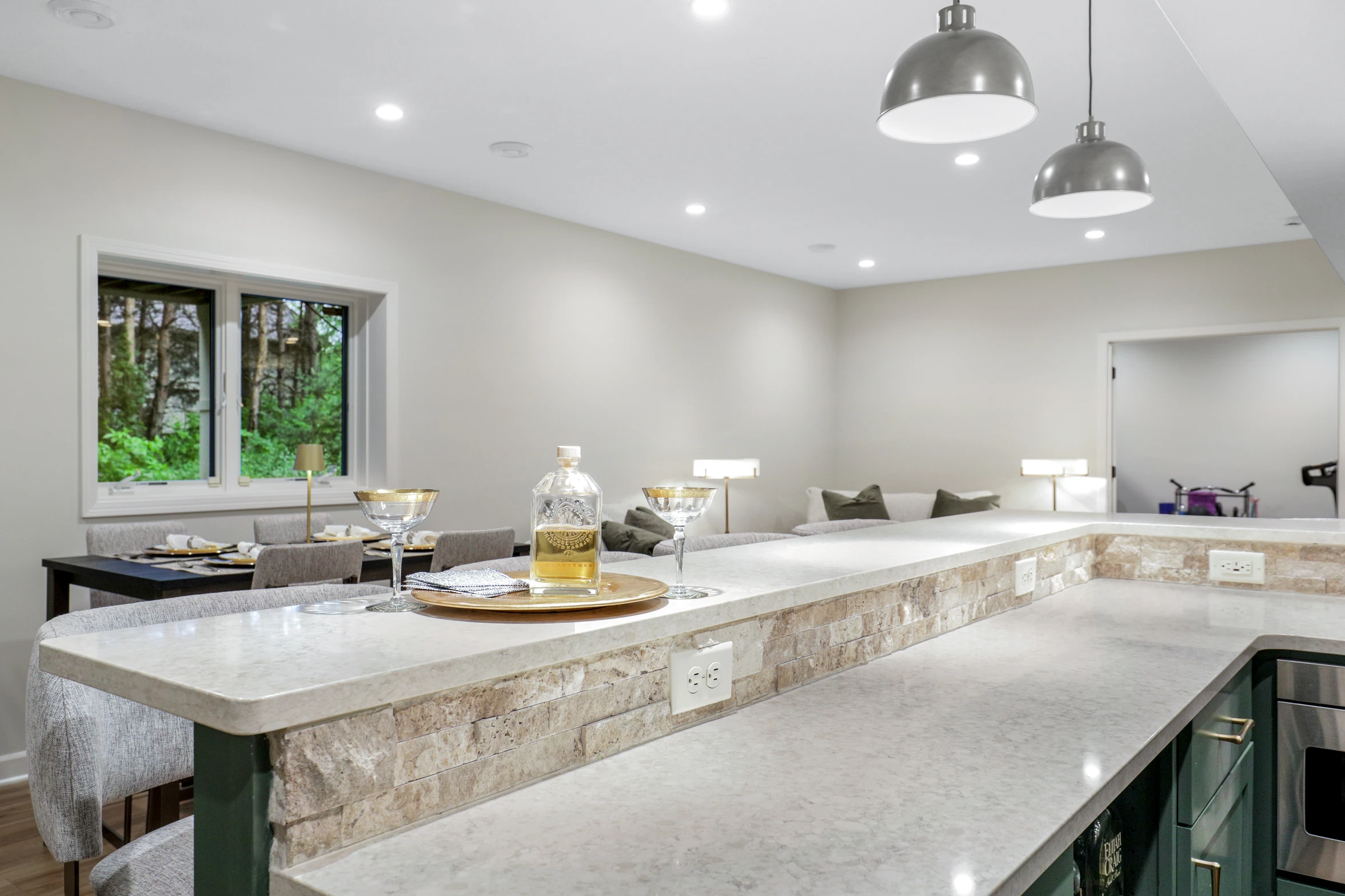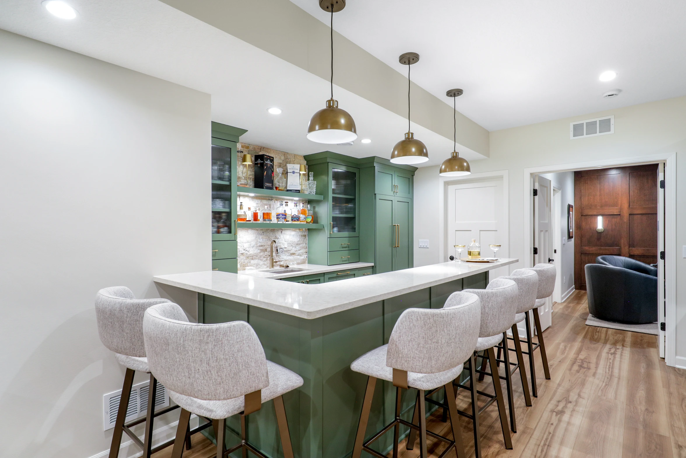 Next, the family room was created to be a cozy yet sophisticated space for relaxation, with comfortable seating, ambient lighting, and modern design elements. Adjacent to it, the wet bar serves as a focal point for entertaining. Equipped with sleek countertops, stylish cabinetry, and all the necessary amenities, it’s a perfect spot for crafting cocktails.