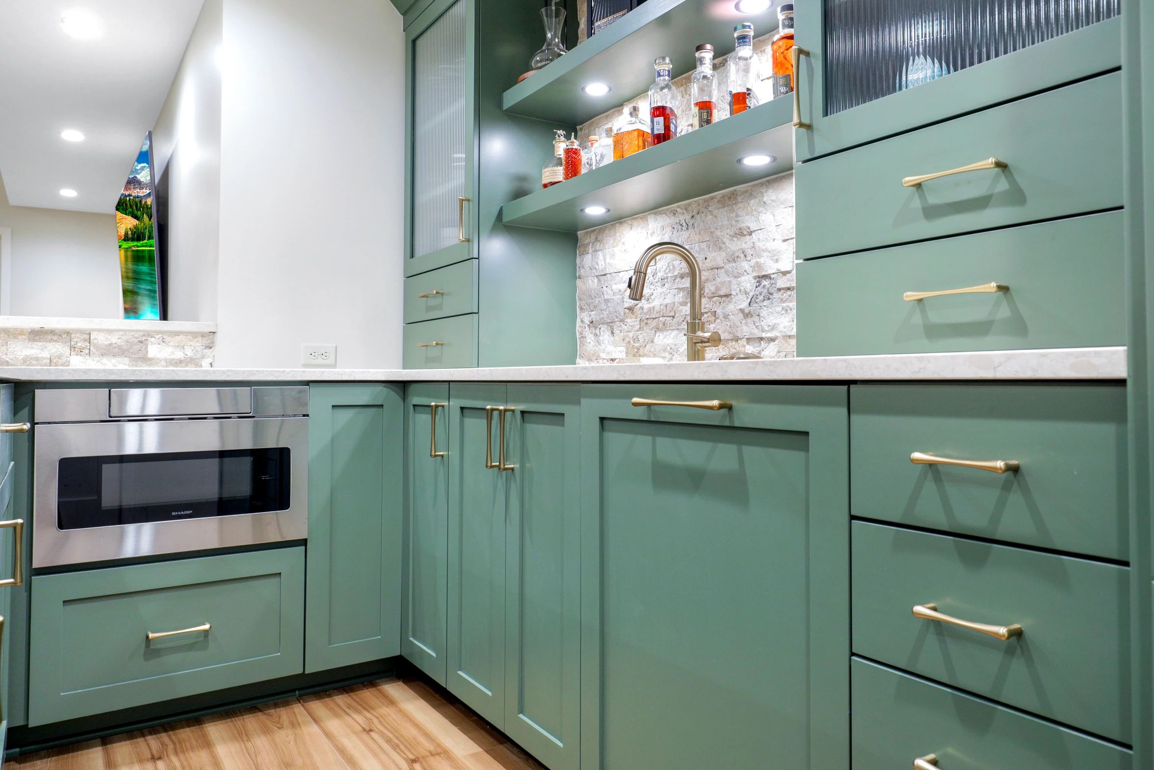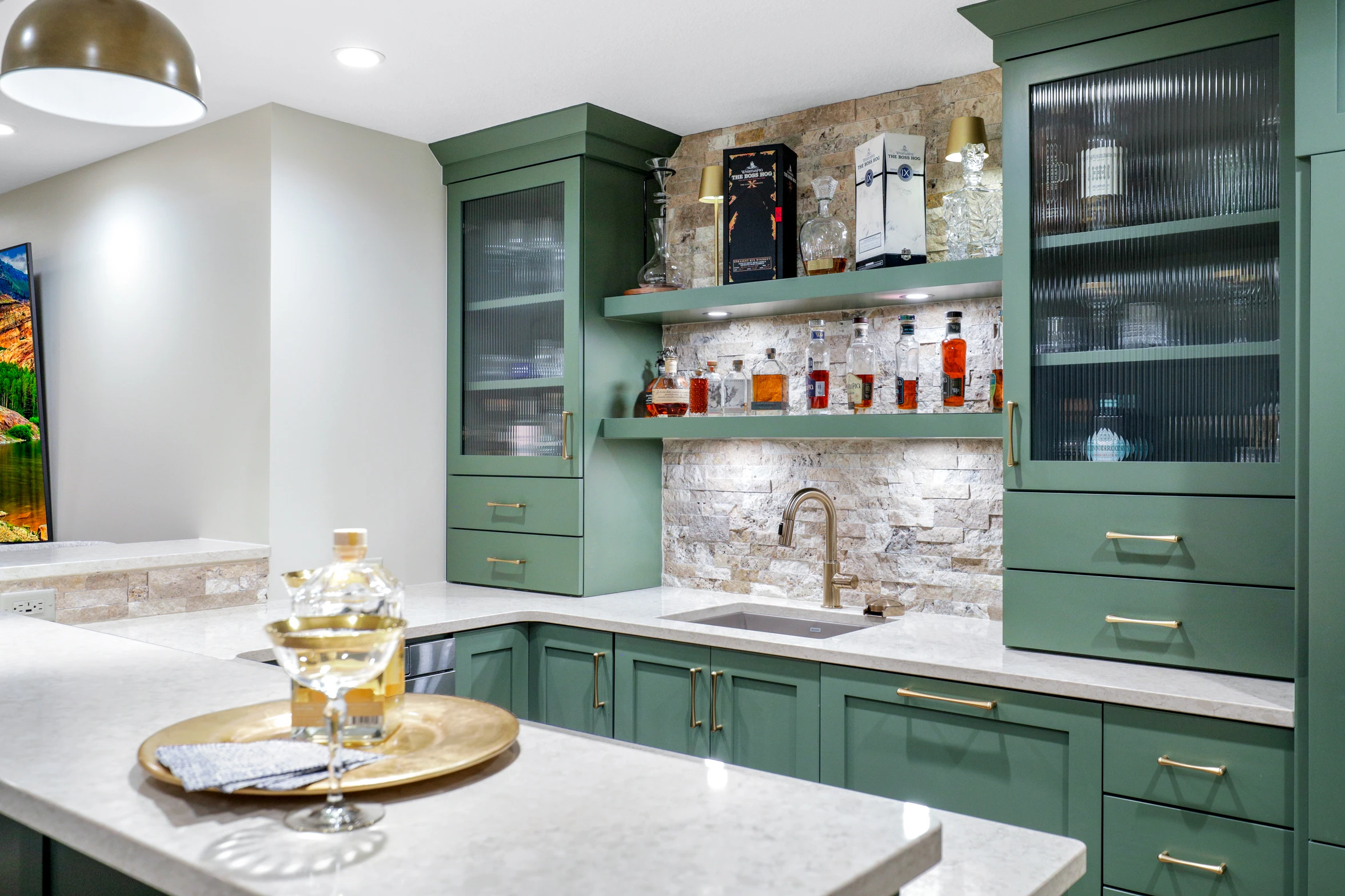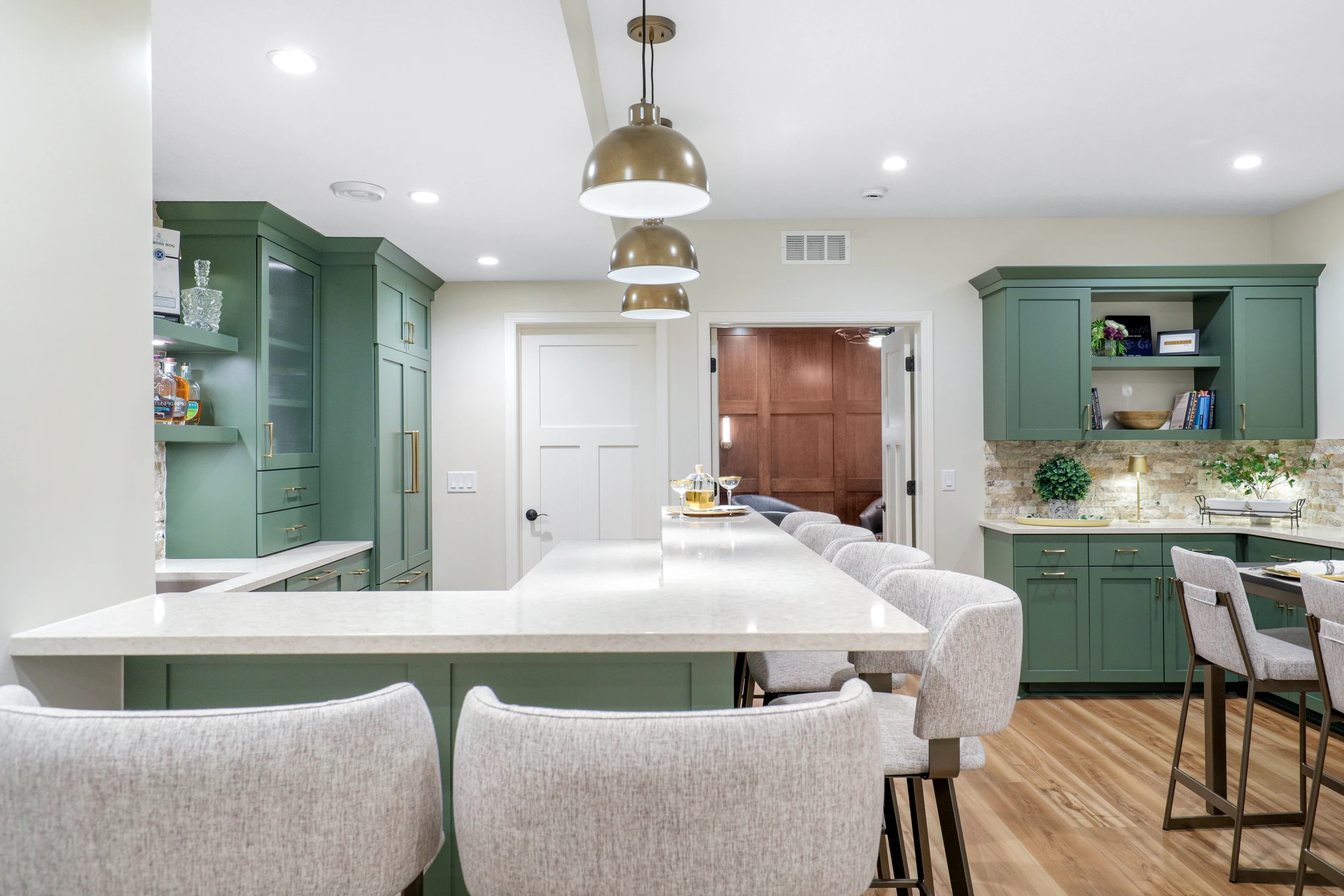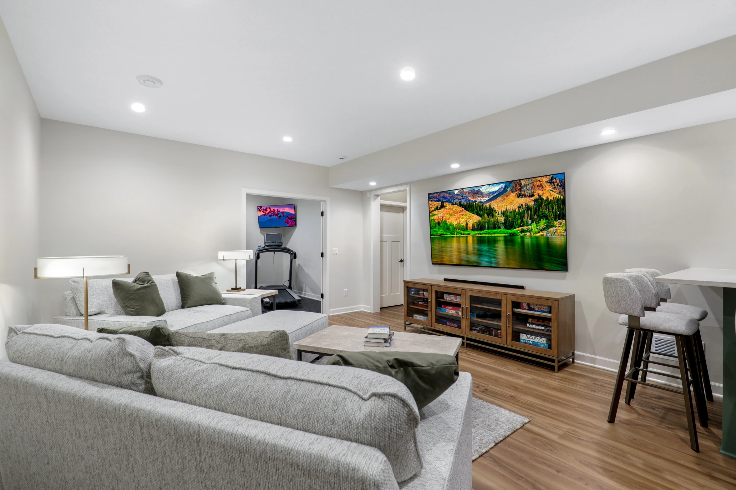 Next, the family room was created to be a cozy yet sophisticated space for relaxation, with comfortable seating, ambient lighting, and modern design elements. Adjacent to it, the wet bar serves as a focal point for entertaining. Equipped with sleek countertops, stylish cabinetry, and all the necessary amenities, it’s a perfect spot for crafting cocktails.