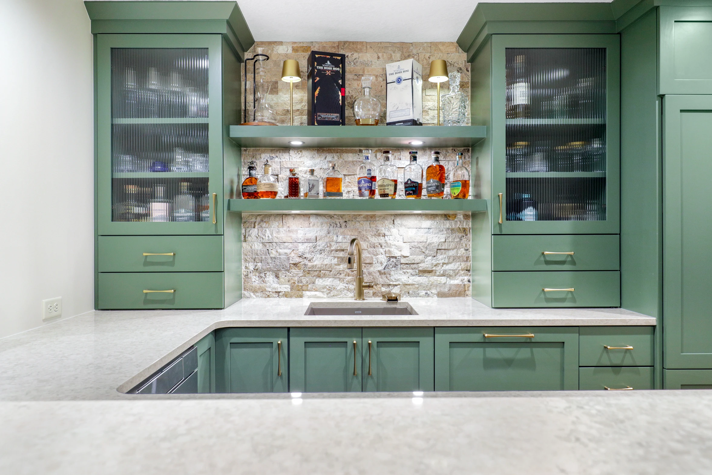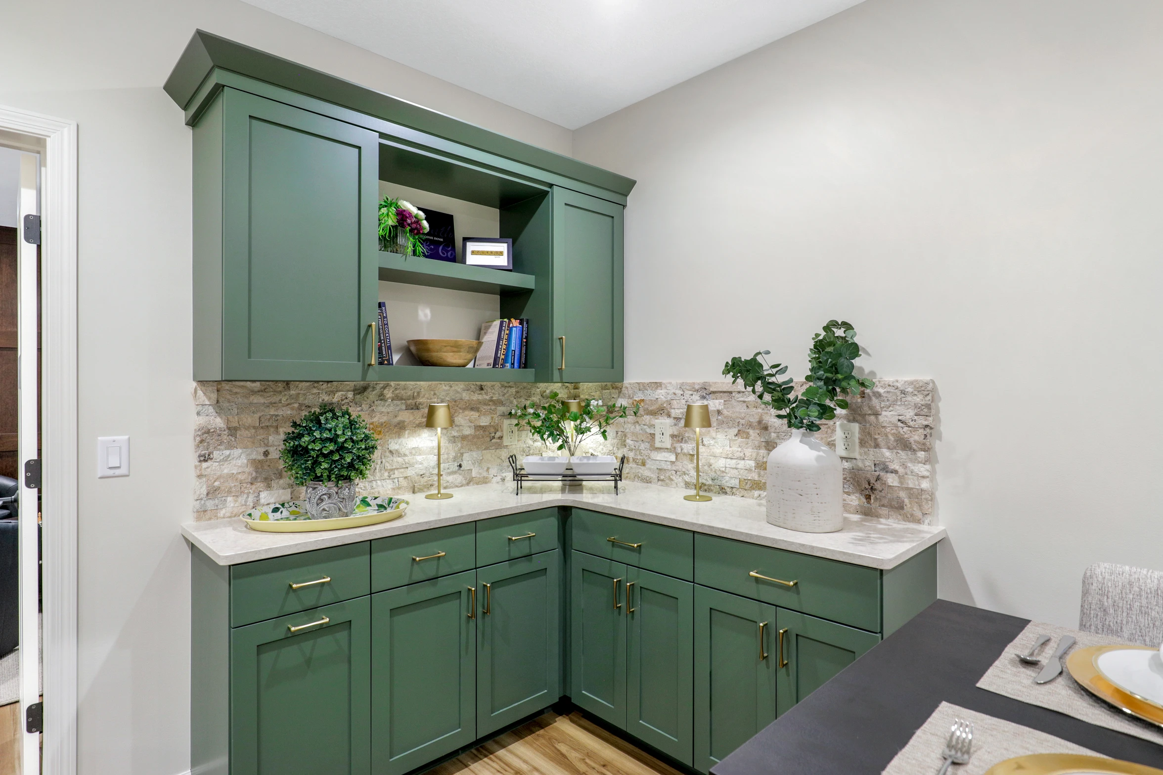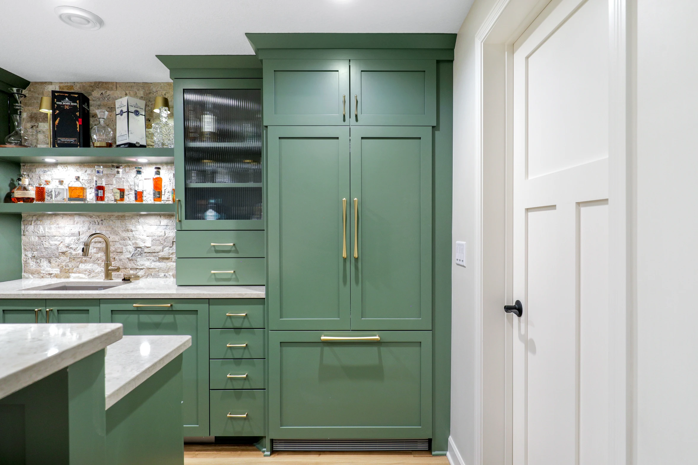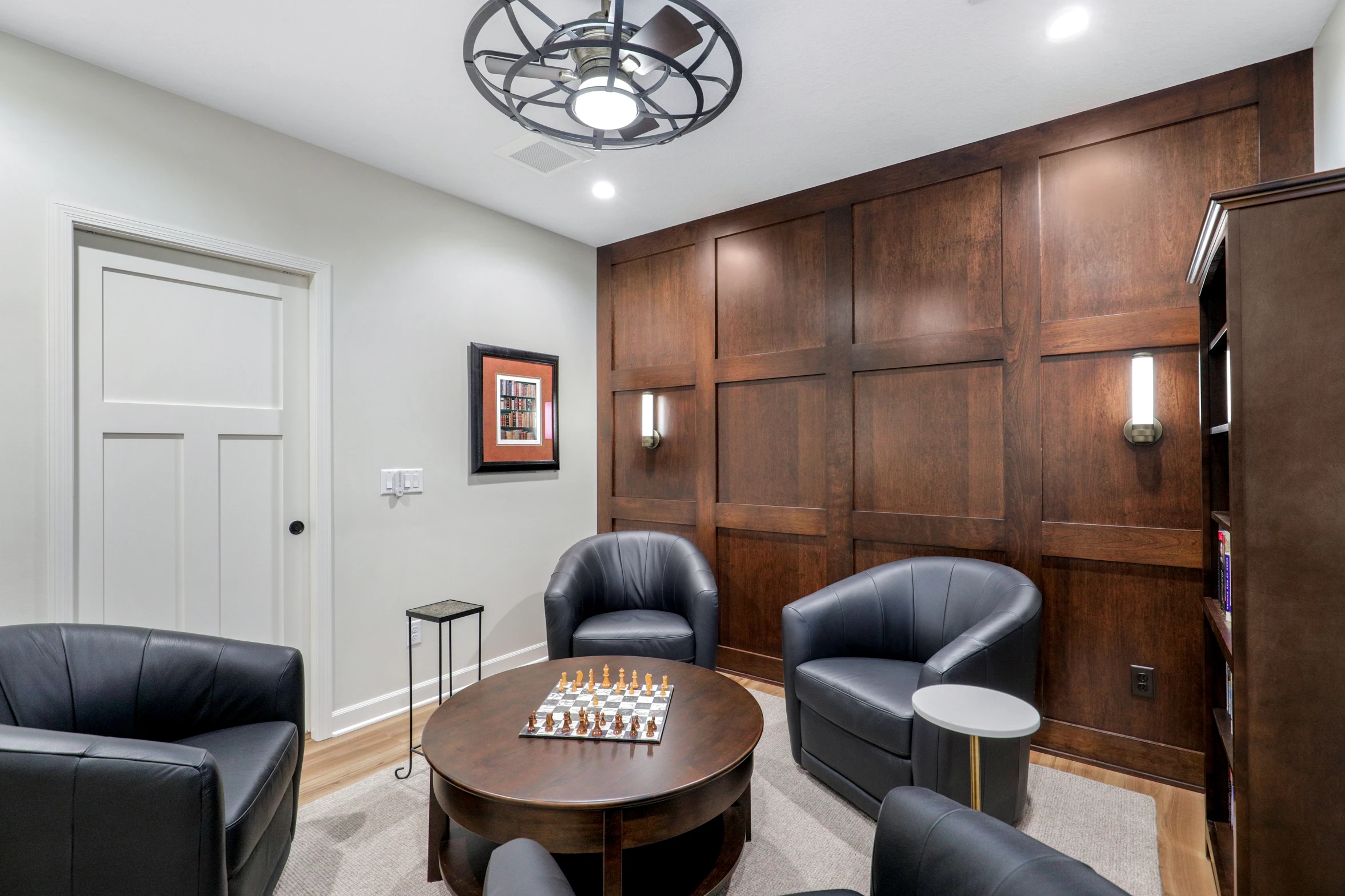 Next, the family room was created to be a cozy yet sophisticated space for relaxation, with comfortable seating, ambient lighting, and modern design elements. Adjacent to it, the wet bar serves as a focal point for entertaining. Equipped with sleek countertops, stylish cabinetry, and all the necessary amenities, it’s a perfect spot for crafting cocktails.
