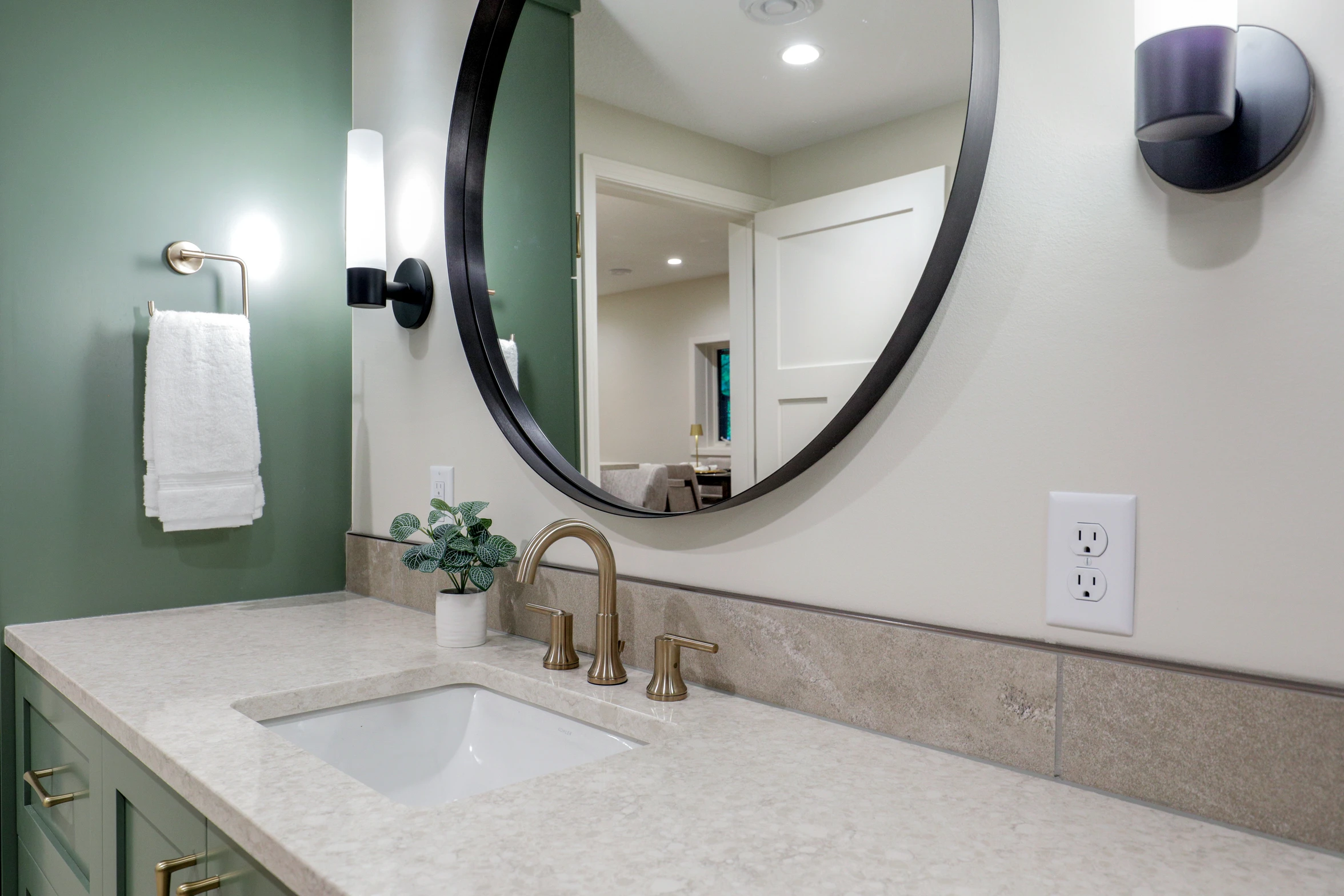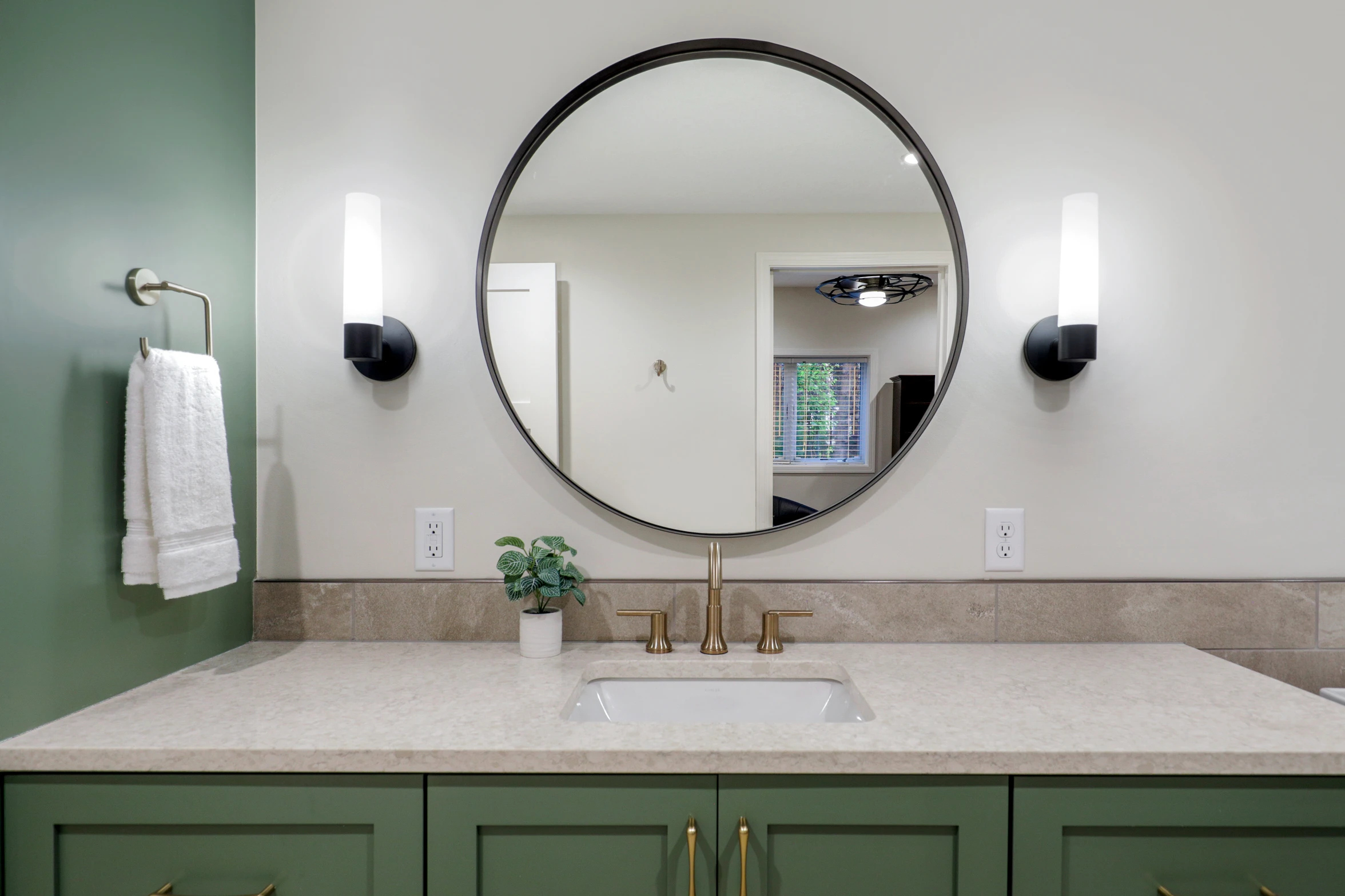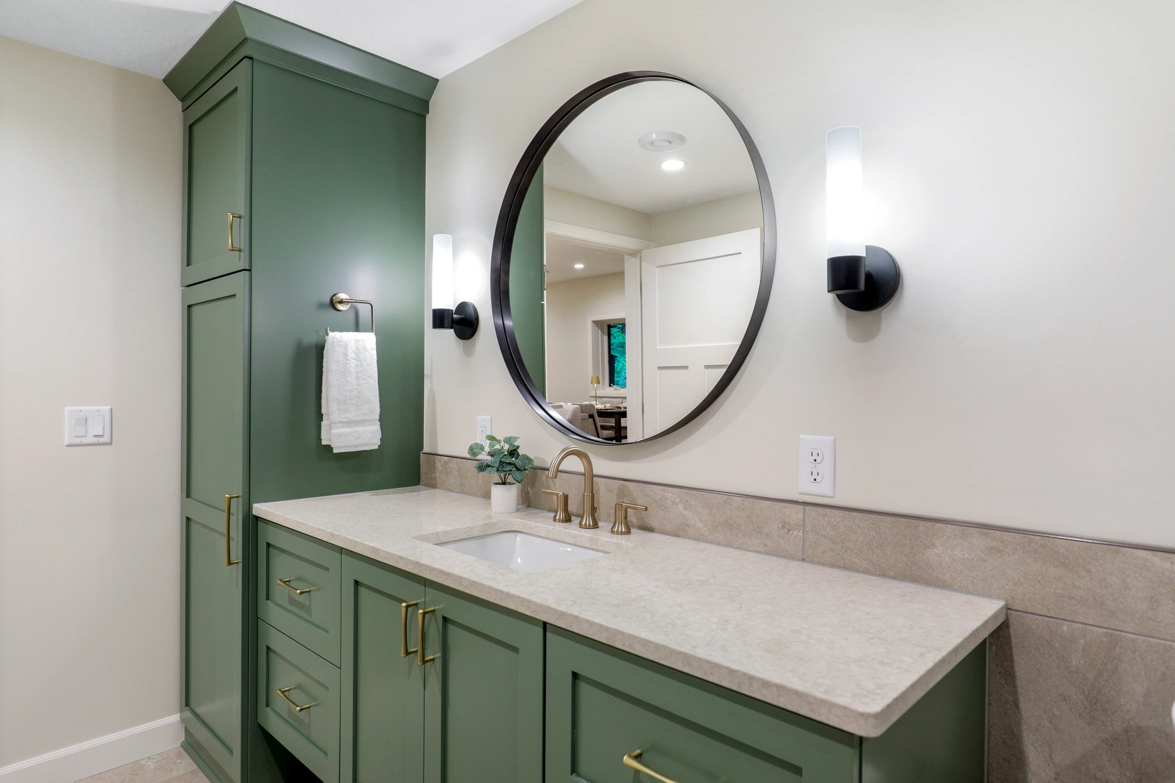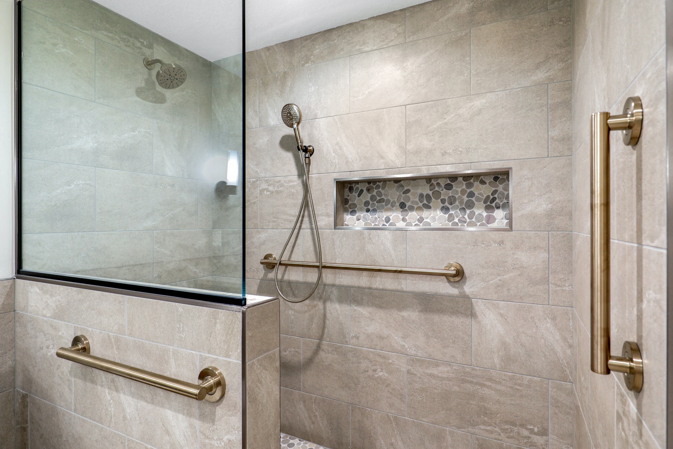 The bathroom was renovated with modern fixtures, stylish tiles, and a spacious layout. Its design seamlessly integrates with the overall theme of the lower level, completing the transformation.